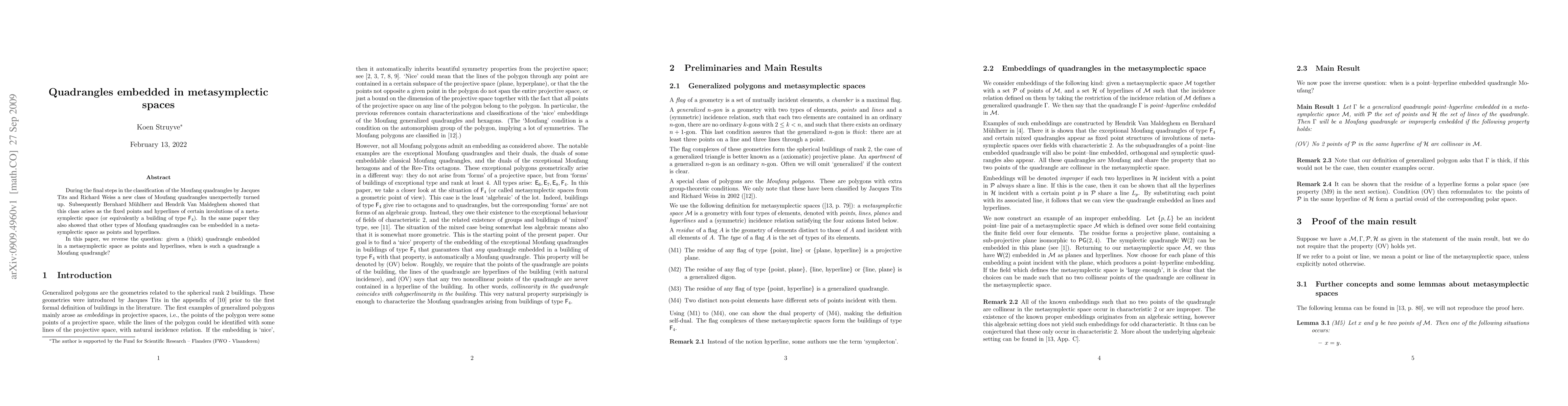 During the final steps in the classification of the Moufang quadrangles by Jacques Tits and Richard Weiss a new class of Moufang quadrangles unexpectedly turned up. Subsequently Bernhard Muhlherr and Hendrik Van Maldeghem showed that this class arises as the fixed points and hyperlines of certain involutions of a metasymplectic space (or equivalently a building of type F_4). In the same paper they also showed that other types of Moufang quadrangles can be embedded in a metasymplectic space as points and hyperlines. In this paper, we reverse the question: given a (thick) quadrangle embedded in a metasymplectic space as points and hyperlines, when is such a quadrangle a Moufang quadrangle?
