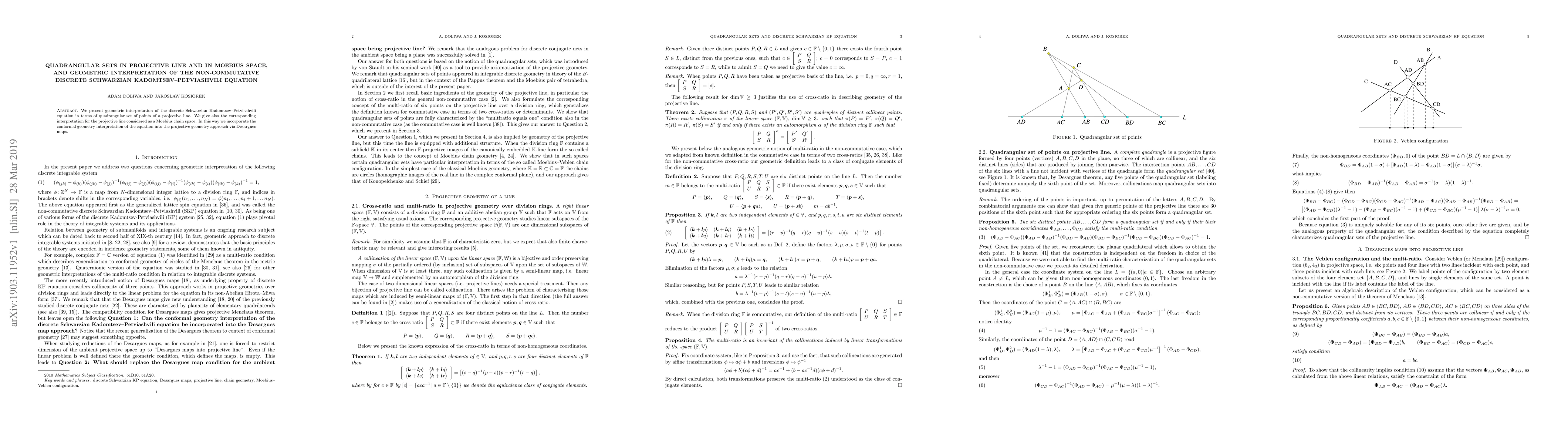 This paper interprets the non-commutative discrete Schwarzian Kadomtsev-Petviashvili equation geometrically using quadrangular sets in projective line and Moebius space, linking conformal geometry with projective geometry through Desargues maps.