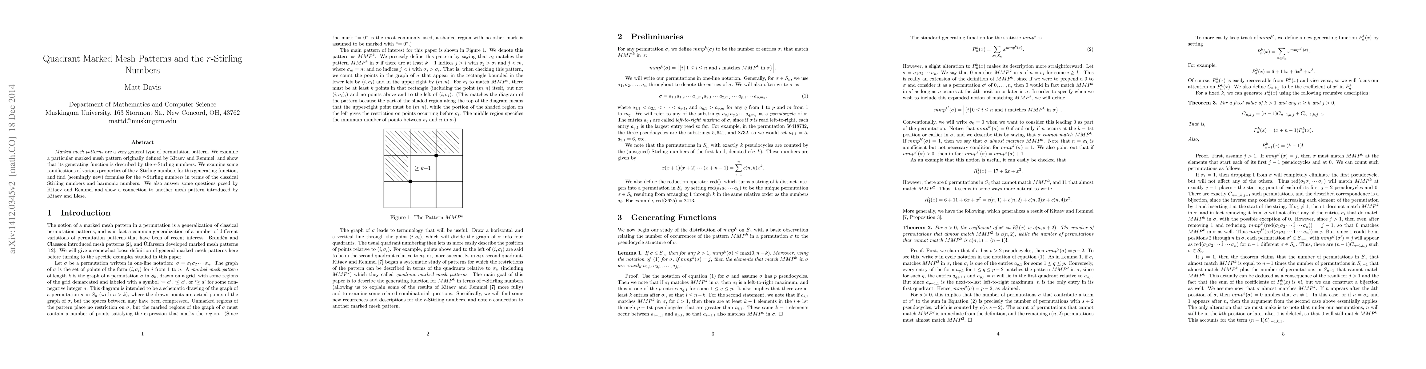 This paper explores marked mesh patterns and establishes their generating function in terms of $r$-Stirling numbers, deriving new formulas relating these to classical Stirling numbers and harmonic numbers. It also resolves questions from previous work and connects to another mesh pattern.
