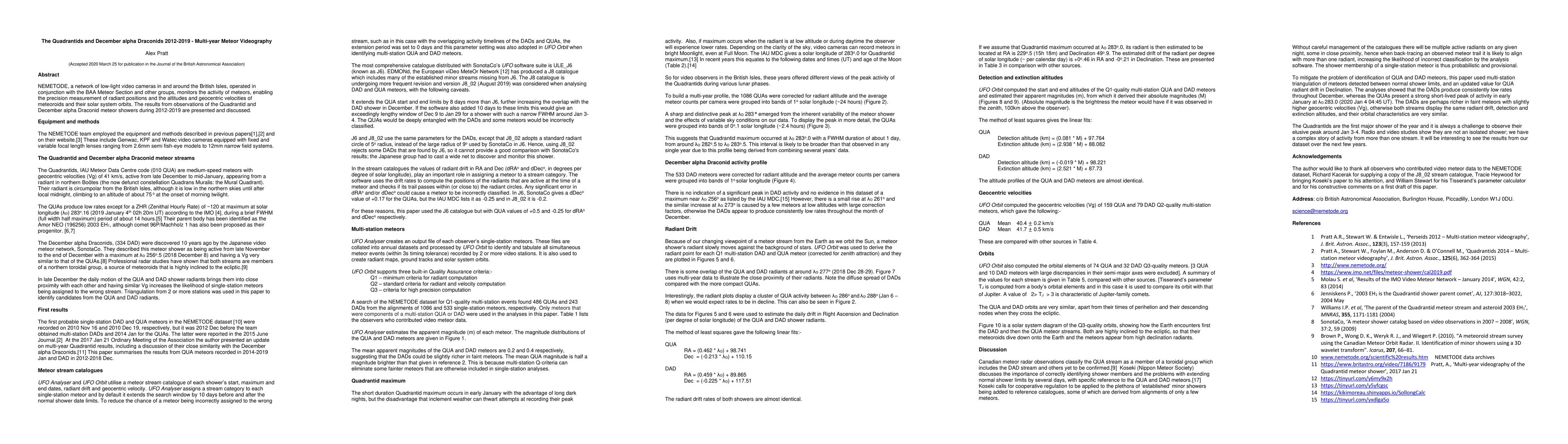 NEMETODE, a network of low-light video cameras in and around the British Isles, operated in conjunction with the BAA Meteor Section and other groups, monitors the activity of meteors, enabling the precision measurement of radiant positions and the altitudes and geocentric velocities of meteoroids and their solar system orbits. The results from observations of the Quadrantid and December alpha Draconid meteor showers during 2012-2019 are presented and discussed.