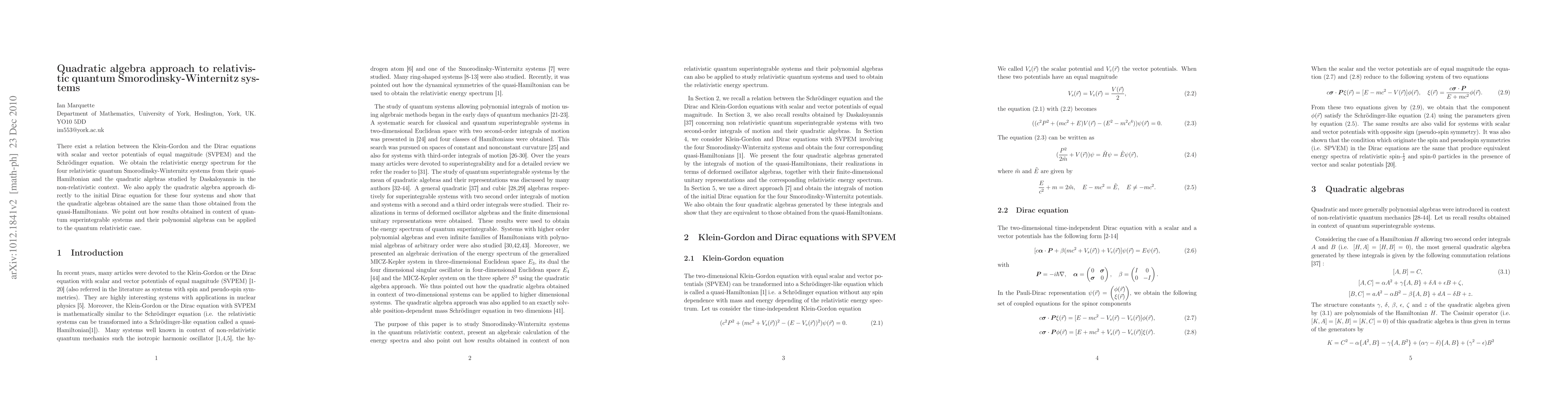 This paper explores the connection between relativistic quantum systems and their non-relativistic counterparts using a quadratic algebra approach. It derives the relativistic energy spectrum for four Smorodinsky-Winternitz systems from the quasi-Hamiltonian and quadratic algebras, demonstrating the applicability of quantum superintegrable systems to the relativistic case.
