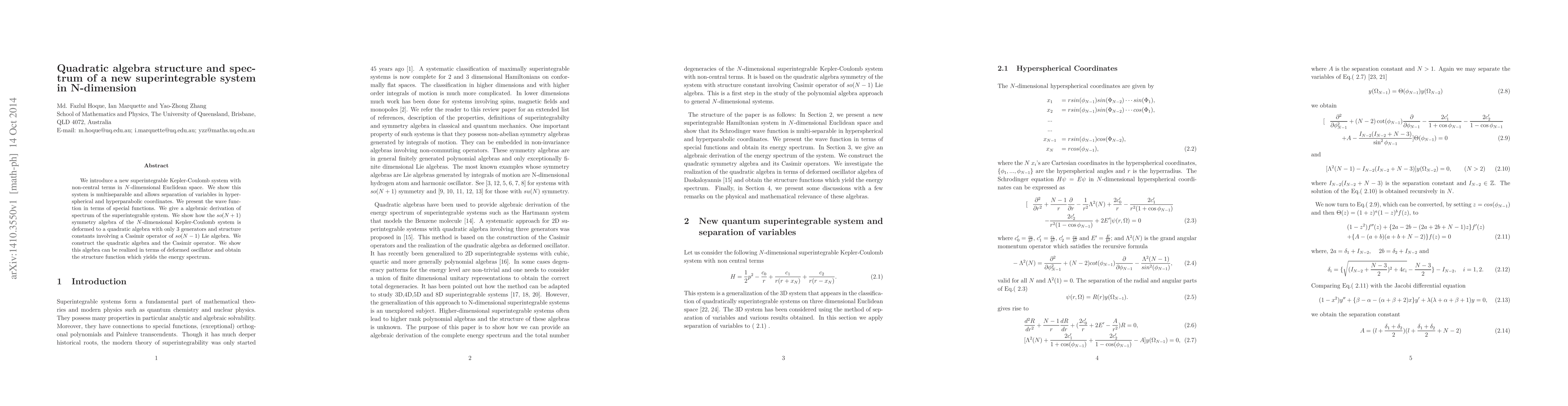 We introduce a new superintegrable Kepler-Coulomb system with non-central terms in $N$-dimensional Euclidean space. We show this system is multiseparable and allows separation of variables in hyperspherical and hyperparabolic coordinates. We present the wave function in terms of special functions. We give a algebraic derivation of spectrum of the superintegrable system. We show how the $so(N+1)$ symmetry algebra of the $N$-dimensional Kepler-Coulomb system is deformed to a quadratic algebra with only 3 generators and structure constants involving a Casimir operator of $so(N-1)$ Lie algebra. We construct the quadratic algebra and the Casimir operator. We show this algebra can be realized in terms of deformed oscillator and obtain the structure function which yields the energy spectrum.