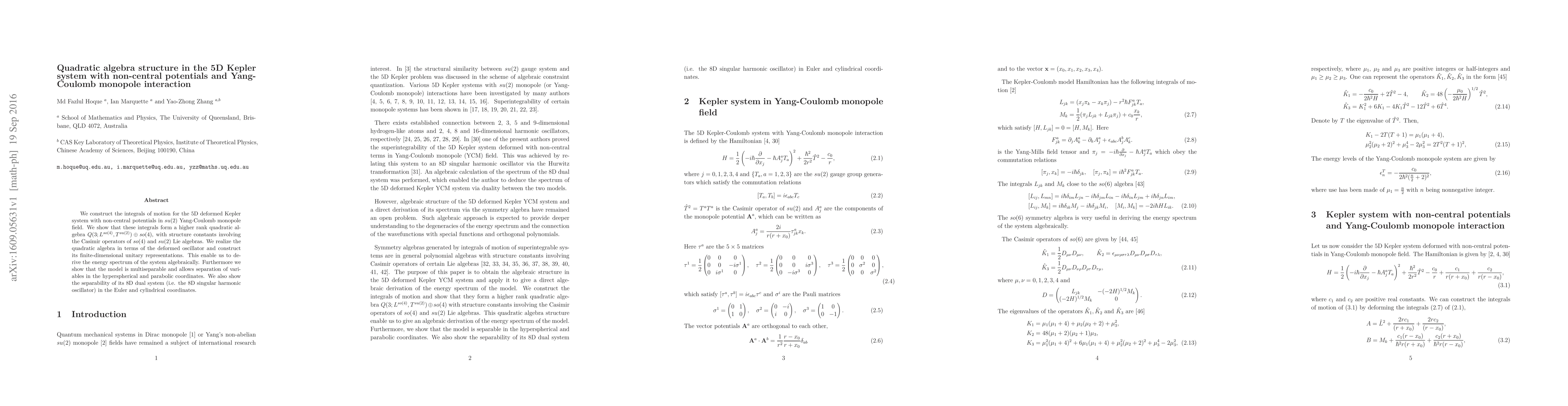 Researchers developed a quadratic algebra structure for a 5D quantum system with non-central potentials, showing it can be used to derive its energy spectrum and allows for separation of variables in specific coordinates.