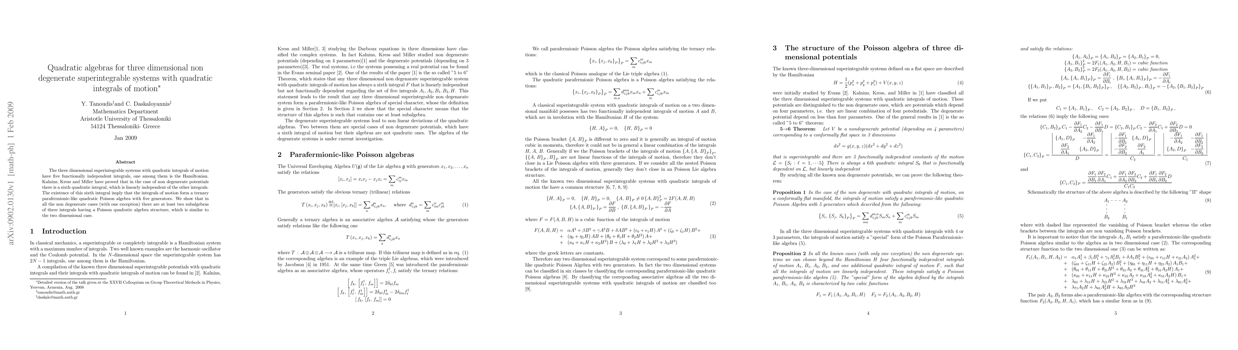 The three dimensional superintegrable systems with quadratic integrals of motion have five functionally independent integrals, one among them is the Hamiltonian. Kalnins, Kress and Miller have proved that in the case of non degenerate potentials there is a sixth quadratic integral, which is linearly independent of the other integrals. The existence of this sixth integral imply that the integrals of motion form a ternary {parafermionic-like} quadratic Poisson algebra with five generators. We show that in all the non degenerate cases (with one exception) there are at least two subalgebras of three integrals having a Poisson quadratic algebra structure, which is similar to the two dimensional case.