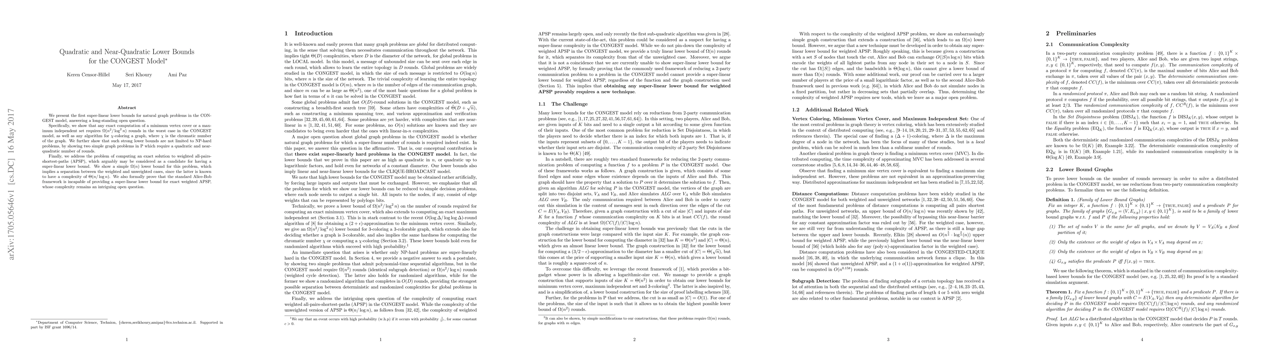 This paper establishes the first super-linear lower bounds for natural graph problems in the CONGEST model, proving $\Omega(n^2/\log^2{n})$ rounds for minimum vertex cover, maximum independent set, and $\chi$-coloring. It also demonstrates quadratic and near-quadratic lower bounds for simple problems in P, and provides an $\Omega(n)$ lower bound for weighted all-pairs-shortest-paths, highlighting a complexity gap between weighted and unweighted versions.
