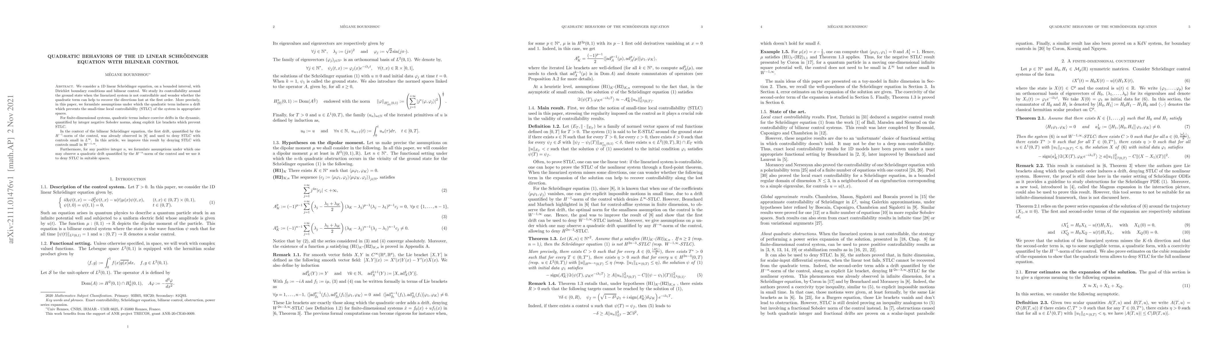 This paper investigates how quadratic terms in a 1D linear Schrödinger equation with bilinear control can prevent small-time local controllability, even when the system is not fully controllable at first order.
