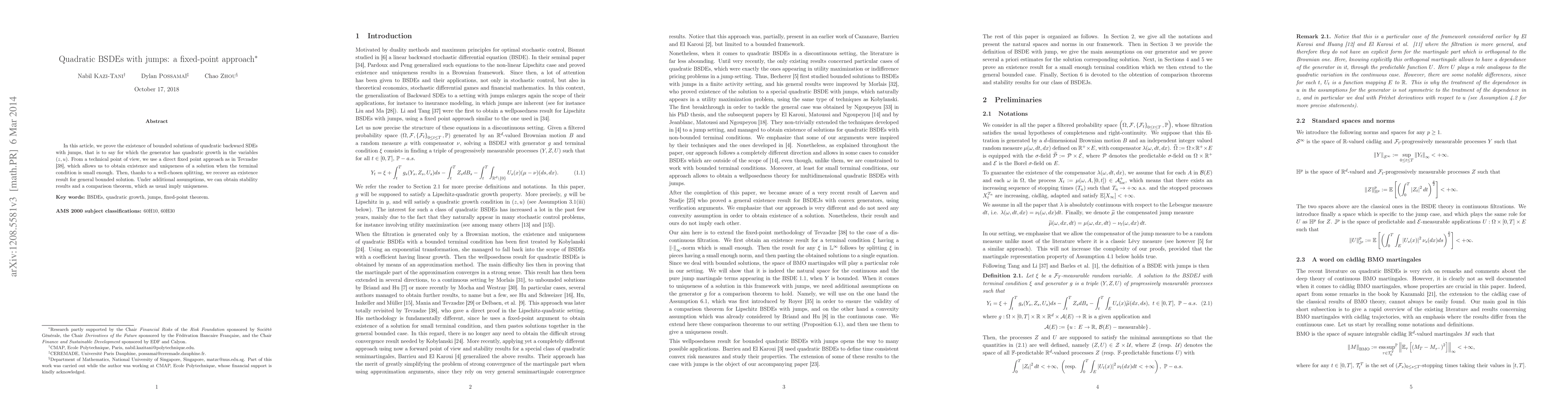 This paper proves the existence of bounded solutions for quadratic backward stochastic differential equations (BSDEs) with jumps using a fixed-point approach. It establishes existence and uniqueness under small terminal conditions and extends the result to general bounded solutions through a strategic splitting technique.
