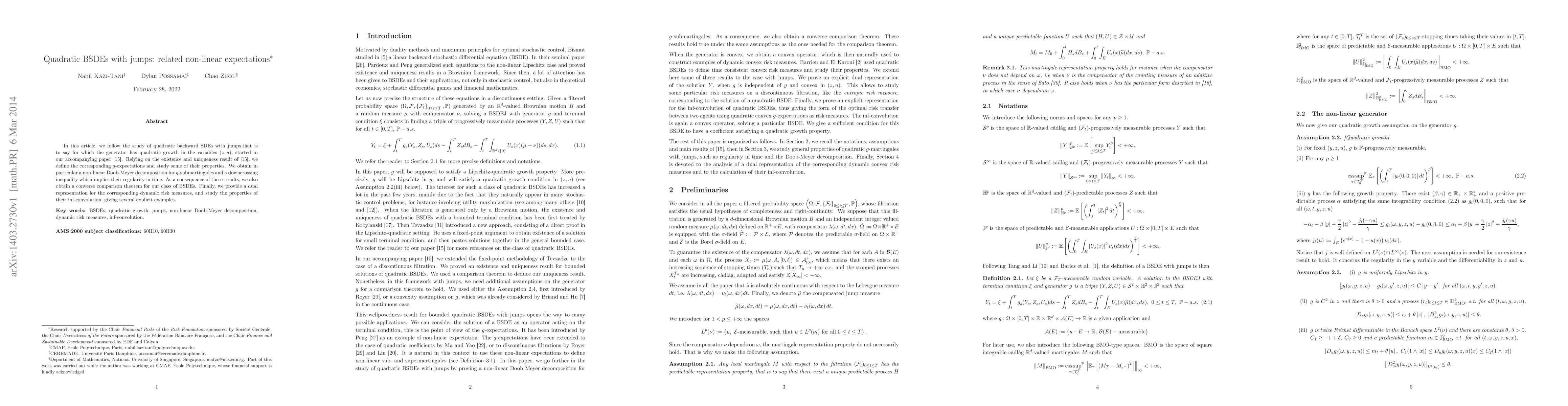 The paper studies quadratic backward stochastic differential equations (BSDEs) with jumps, focusing on generators with quadratic growth in (z, u). It builds upon an earlier work, deriving g-expectations and examining their properties, including a non-linear Doob-Meyer decomposition for g-submartingales and a downcrossing inequality.