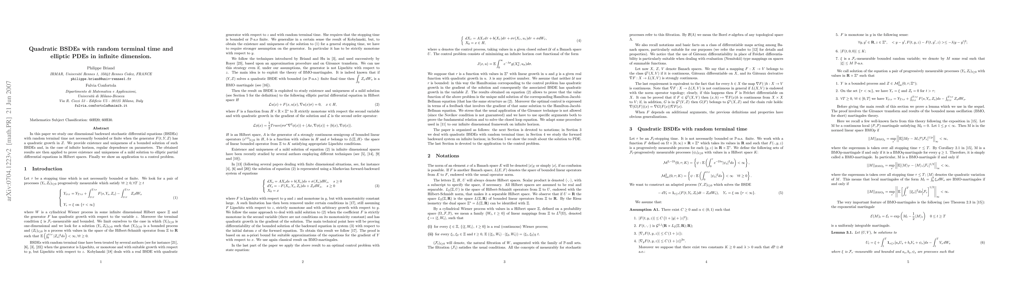This paper investigates one-dimensional BSDEs with unbounded random terminal times and quadratic growth in the Z variable, proving existence and uniqueness of bounded solutions. It also applies these results to establish existence and uniqueness for solutions to elliptic PDEs in infinite-dimensional Hilbert spaces.