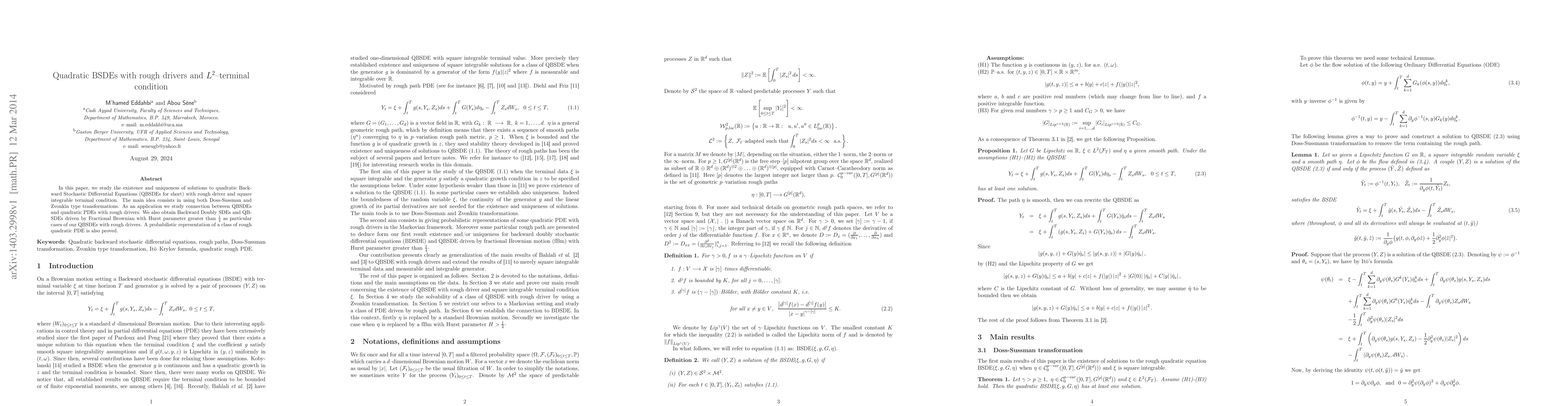 This paper investigates the existence and uniqueness of solutions for quadratic Backward Stochastic Differential Equations (QBSDEs) driven by rough signals and with an $L^2$-terminal condition, employing Doss-Sussman and Zvonkin transformations. It also explores the connection between QBSDEs and quadratic PDEs with rough drivers, and provides a probabilistic representation for a class of rough quadratic PDEs.