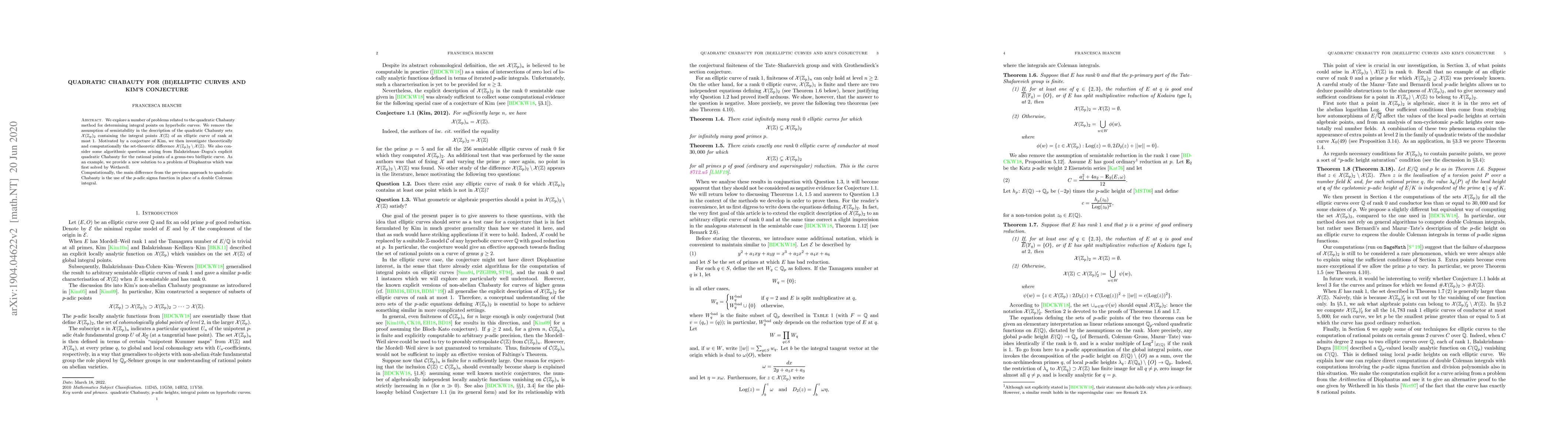 We explore a number of problems related to the quadratic Chabauty method for determining integral points on hyperbolic curves. We remove the assumption of semistability in the description of the quadratic Chabauty sets $\mathcal{X}(\mathbb{Z}_p)_2$ containing the integral points $\mathcal{X}(\mathbb{Z})$ of an elliptic curve of rank at most $1$. Motivated by a conjecture of Kim, we then investigate theoretically and computationally the set-theoretic difference $\mathcal{X}(\mathbb{Z}_p)_2\setminus \mathcal{X}(\mathbb{Z})$. We also consider some algorithmic questions arising from Balakrishnan--Dogra's explicit quadratic Chabauty for the rational points of a genus-two bielliptic curve. As an example, we provide a new solution to a problem of Diophantus which was first solved by Wetherell. Computationally, the main difference from the previous approach to quadratic Chabauty is the use of the $p$-adic sigma function in place of a double Coleman integral.