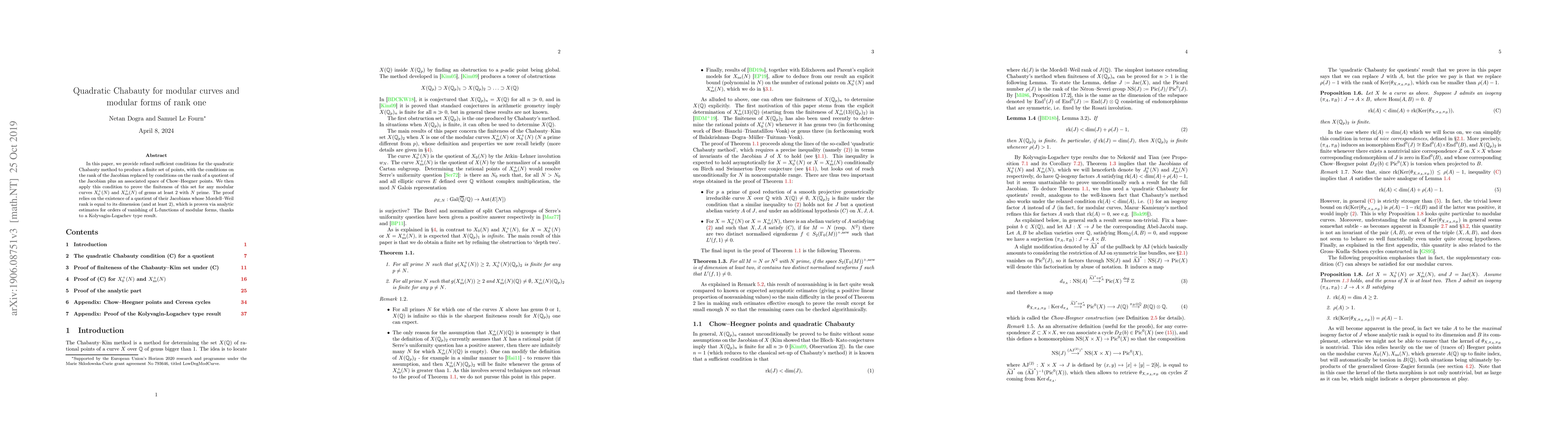This paper refines the quadratic Chabauty method to determine a finite set of points on modular curves, focusing on conditions based on the rank of a Jacobian quotient rather than just the Jacobian's rank. It proves the finiteness of this set for specific modular curves of genus at least 2, relying on analytic estimates and a Kolyvagin-Logachev type result.