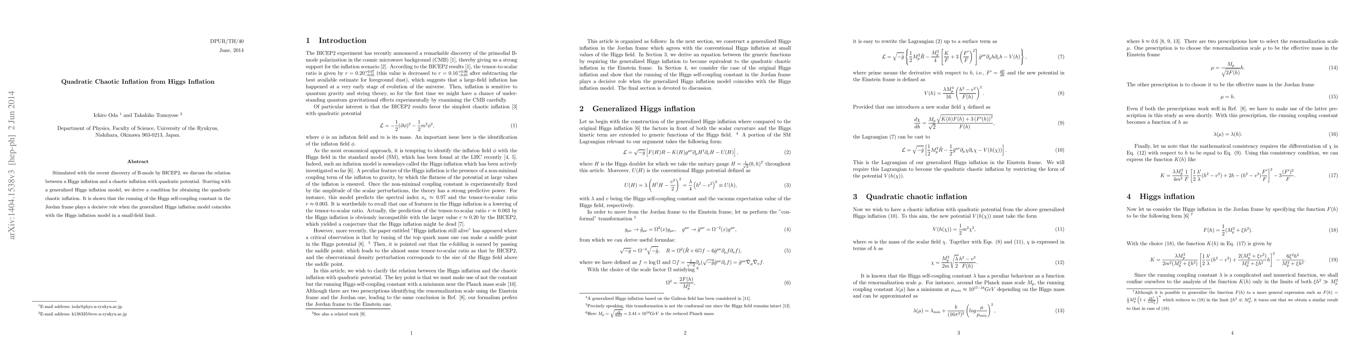 This paper explores the connection between generalized Higgs inflation and quadratic chaotic inflation, deriving a condition for their equivalence. It highlights the importance of the running Higgs self-coupling constant in the Jordan frame for achieving this relation in the small-field limit.