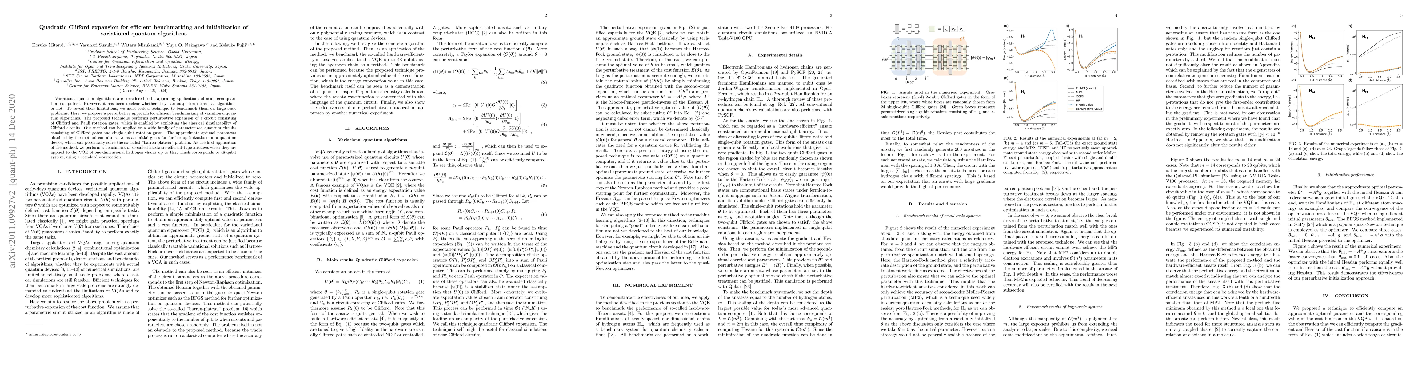 This paper proposes a perturbative approach for benchmarking variational quantum algorithms by expanding circuits using Clifford and Pauli rotation gates, leveraging the classical simulatability of Clifford circuits. The method provides an approximate optimal parameter initialization, potentially solving the "barren-plateau" problem, and is demonstrated through a benchmark of hardware-efficient ansatzes for VQE on hydrogen chains up to $\mathrm{H}_{24}$.