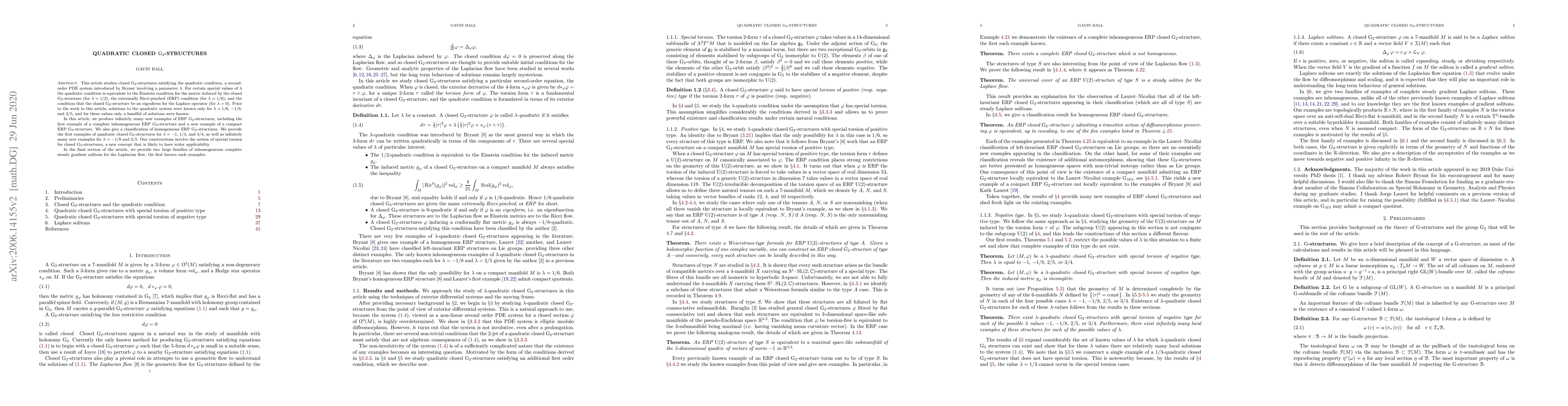 This article studies closed G2-structures satisfying the quadratic condition, a second-order PDE system introduced by Bryant involving a parameter $\lambda.$ For certain special values of $\lambda$ the quadratic condition is equivalent to the Einstein condition for the metric induced by the closed G2-structure (for $\lambda = 1/2$), the extremally Ricci-pinched (ERP) condition (for $\lambda=1/6$), and the condition that the closed G2-structure be an eigenform for the Laplace operator (for $\lambda = 0$). Prior to the work in this article, solutions to the quadratic system were known only for $\lambda = 1/6,$ $-1/8,$ and $2/5,$ and for these values only a handful of solutions were known. In this article, we produce infinitely many new examples of ERP G2-structures, including the first example of a complete inhomogeneous ERP G2-structure and a new example of a compact ERP G2-structure. We also give a classification of homogeneous ERP G2-structures. We provide the first examples of quadratic closed G2-structures for $\lambda = -1,$ $1/3,$ and $3/4,$ as well as infinitely many new examples for $\lambda = -1/8$ and $2/5.$ Our constructions involve the notion of special torsion for closed G2-structures, a new concept that is likely to have wider applicability. In the final section of the article, we provide two large families of inhomogeneous complete steady gradient solitons for the Laplacian flow, the first known such examples.
