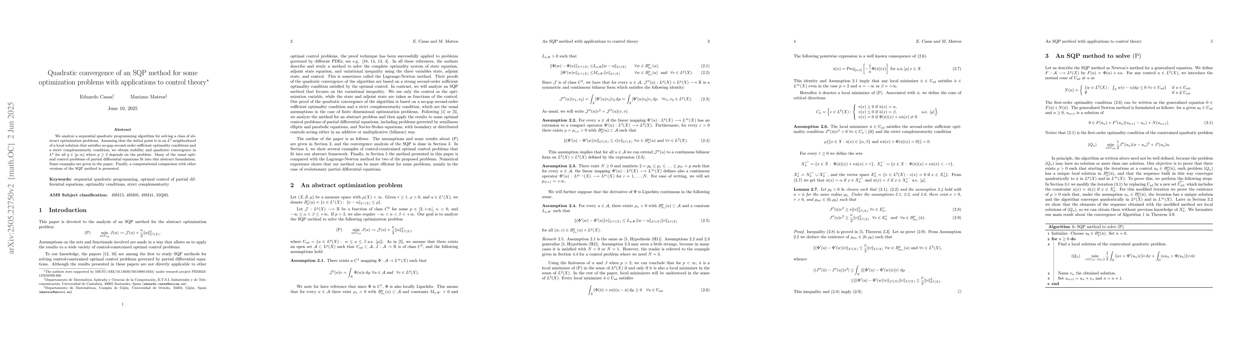 A quadratic convergence analysis of an SQP method is presented for solving optimization problems in control theory, achieving stability in $L^q$ space for $q eq 2$, with applications to partial differential equations.