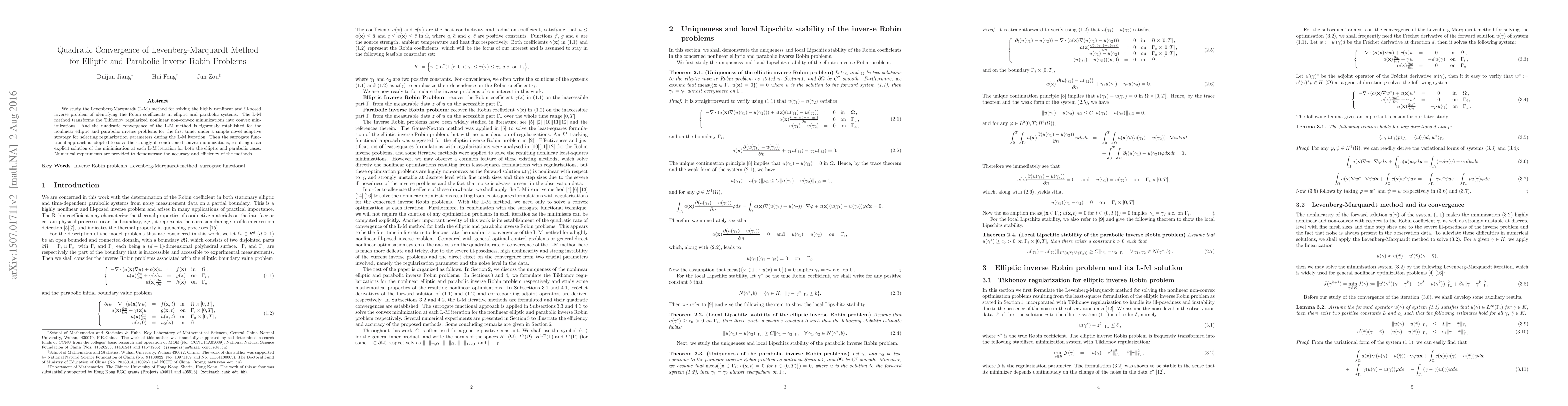 We study the Levenberg-Marquardt (L-M) method for solving the highly nonlinear and ill-posed inverse problem of identifying the Robin coefficients in elliptic and parabolic systems. The L-M method transforms the Tikhonov regularized nonlinear non-convex minimizations into convex minimizations. And the quadratic convergence of the L-M method is rigorously established for the nonlinear elliptic and parabolic inverse problems for the first time, under a simple novel adaptive strategy for selecting regularization parameters during the L-M iteration. Then the surrogate functional approach is adopted to solve the strongly ill-conditioned convex minimizations, resulting in an explicit solution of the minimisation at each L-M iteration for both the elliptic and parabolic cases. Numerical experiments are provided to demonstrate the accuracy and efficiency of the methods.