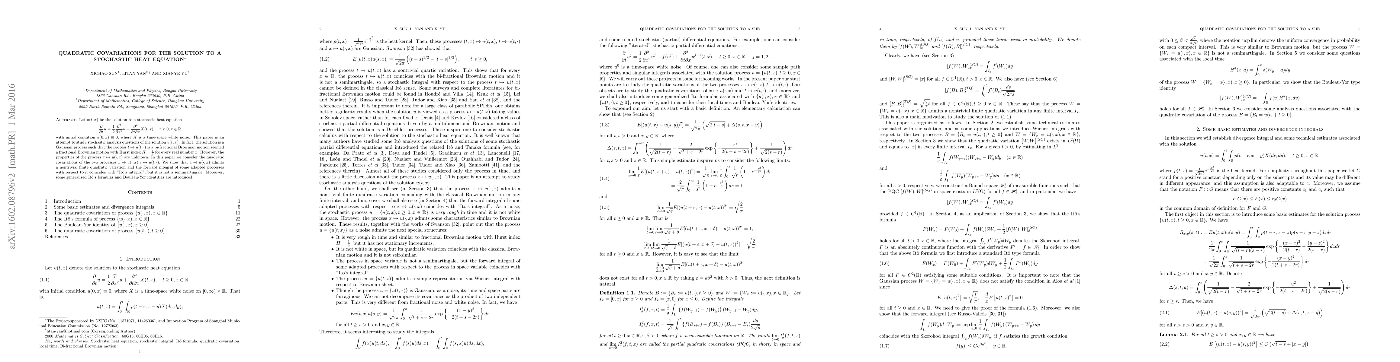 The paper studies a stochastic heat equation with white noise, finding that the solution is a Gaussian process representing bi-fractional Brownian motion for $t o u(t,x)$ but not for $x o u(ullet,x)$. The quadratic covariations of these processes reveal non-trivial properties.