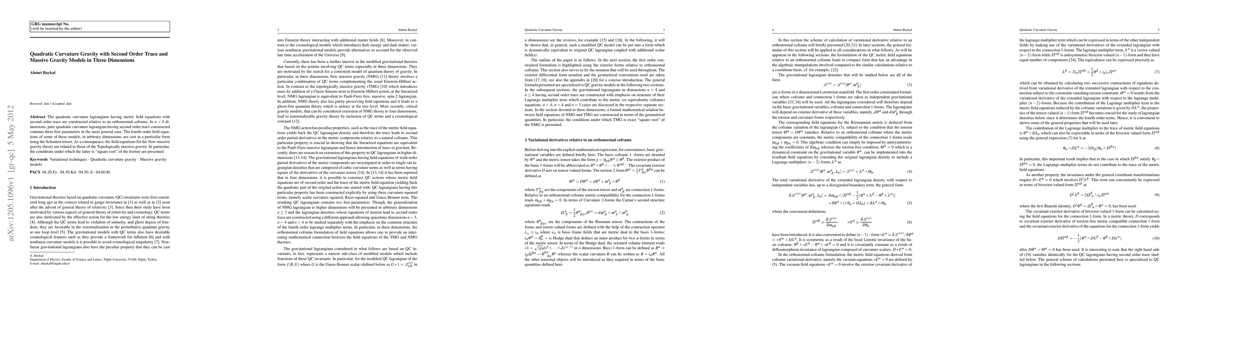 The quadratic curvature lagrangians having metric field equations with second order trace are constructed relative to an orthonormal coframe. In $n>4$ dimensions, pure quadratic curvature lagrangian having second order trace constructed contains three free parameters in the most general case. The fourth order field equations of some of these models, in arbitrary dimensions, are cast in a particular form using the Schouten tensor. As a consequence, the field equations for the New massive gravity theory are related to those of the Topologically massive gravity. In particular, the conditions under which the latter is "square root" of the former are presented.