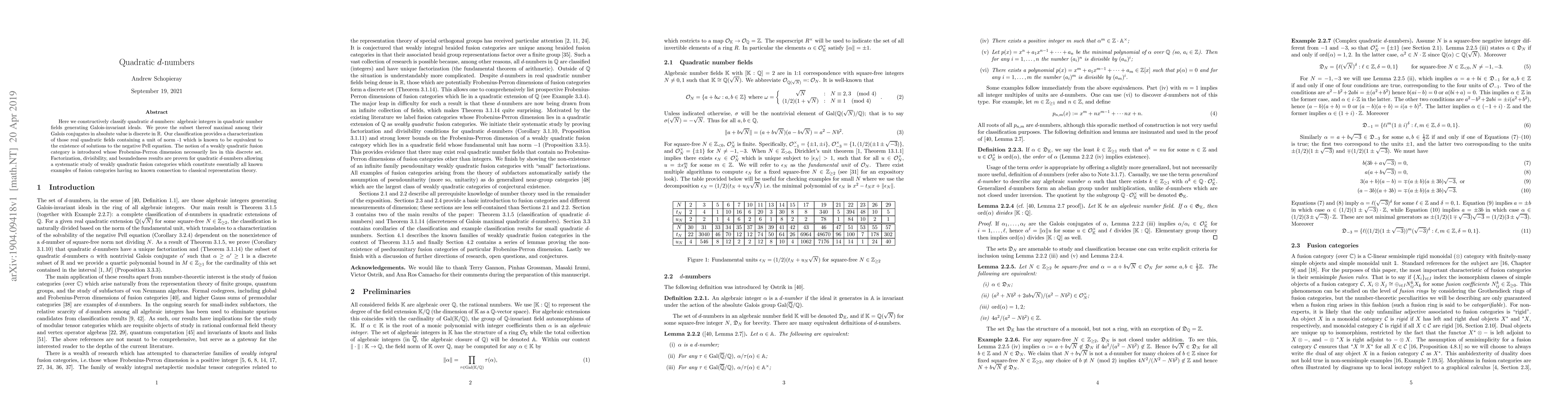 Here we constructively classify quadratic $d$-numbers: algebraic integers in quadratic number fields generating Galois-invariant ideals. We prove the subset thereof maximal among their Galois conjugates in absolute value is discrete in $\mathbb{R}$. Our classification provides a characterization of those real quadratic fields containing a unit of norm -1 which is known to be equivalent to the existence of solutions to the negative Pell equation. The notion of a weakly quadratic fusion category is introduced whose Frobenius-Perron dimension necessarily lies in this discrete set. Factorization, divisibility, and boundedness results are proven for quadratic $d$-numbers allowing a systematic study of weakly quadratic fusion categories which constitute essentially all known examples of fusion categories having no known connection to classical representation theory.