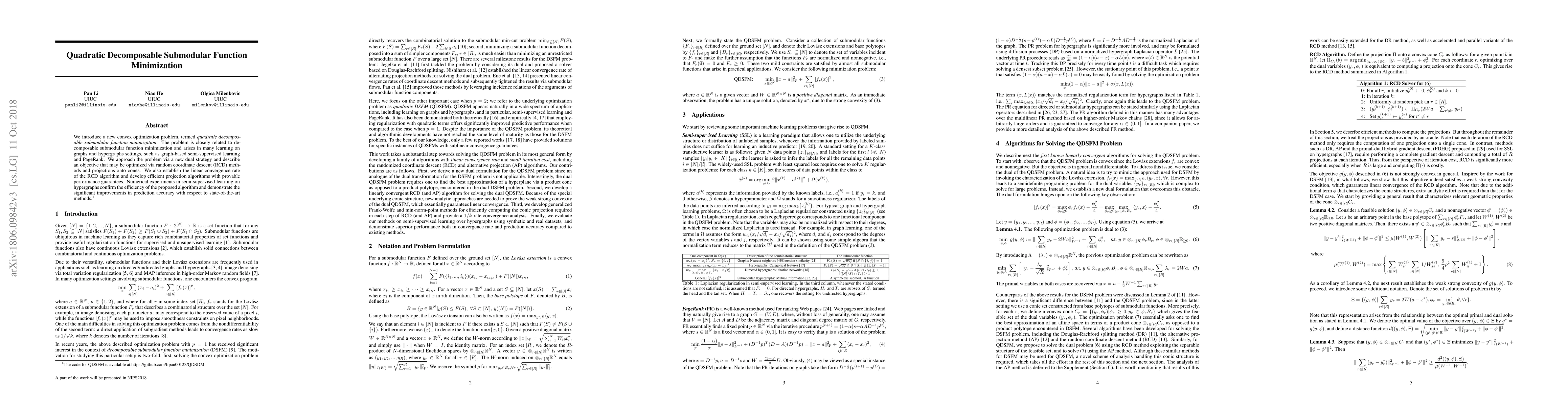This paper introduces a novel convex optimization problem for minimizing quadratic decomposable submodular functions, relevant to graph-based learning tasks. It proposes a dual strategy and random coordinate descent method with linear convergence, supported by efficient projection algorithms. Experimental results show significant improvements in semi-supervised learning on hypergraphs.