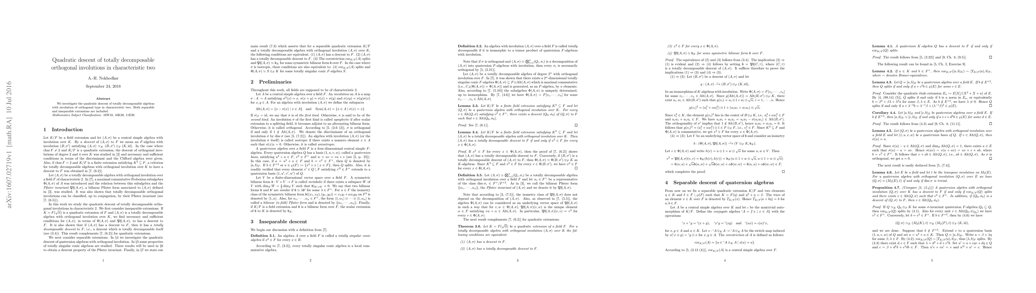 Summary: This paper explores the quadratic descent properties of totally decomposable orthogonal algebras with involution in fields of characteristic two, encompassing both separable and inseparable extensions.