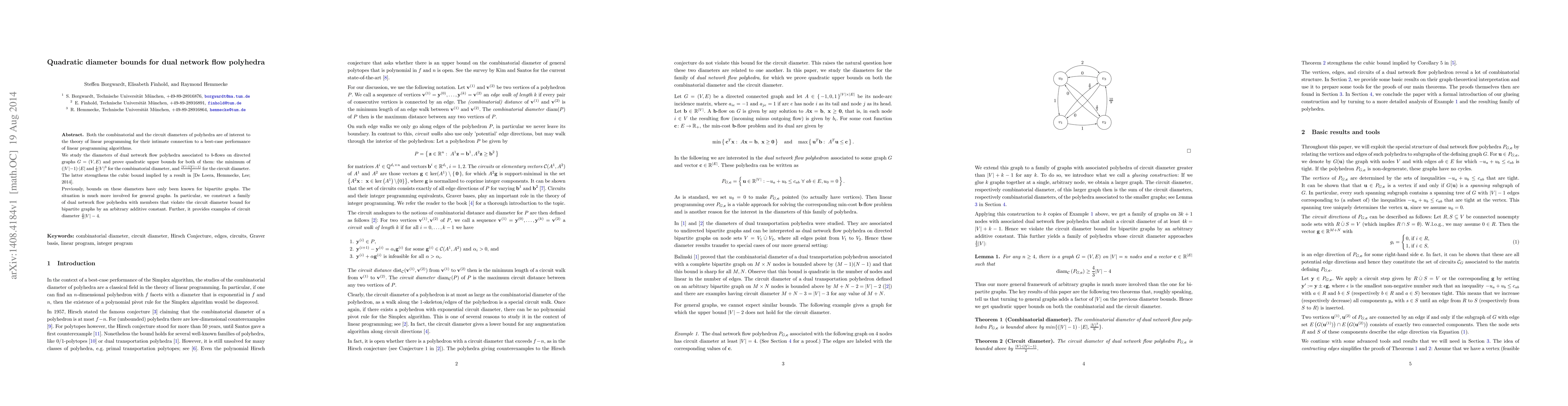 Both the combinatorial and the circuit diameters of polyhedra are of interest to the theory of linear programming for their intimate connection to a best-case performance of linear programming algorithms. We study the diameters of dual network flow polyhedra associated to $b$-flows on directed graphs $G=(V,E)$ and prove quadratic upper bounds for both of them: the minimum of $(|V|-1)\cdot |E|$ and $\frac{1}{6}|V|^3$ for the combinatorial diameter, and $\frac{|V|\cdot (|V|-1)}{2}$ for the circuit diameter. The latter strengthens the cubic bound implied by a result in [De Loera, Hemmecke, Lee; 2014]. Previously, bounds on these diameters have only been known for bipartite graphs. The situation is much more involved for general graphs. In particular, we construct a family of dual network flow polyhedra with members that violate the circuit diameter bound for bipartite graphs by an arbitrary additive constant. Further, it provides examples of circuit diameter $\frac{4}{3}|V| - 4$.