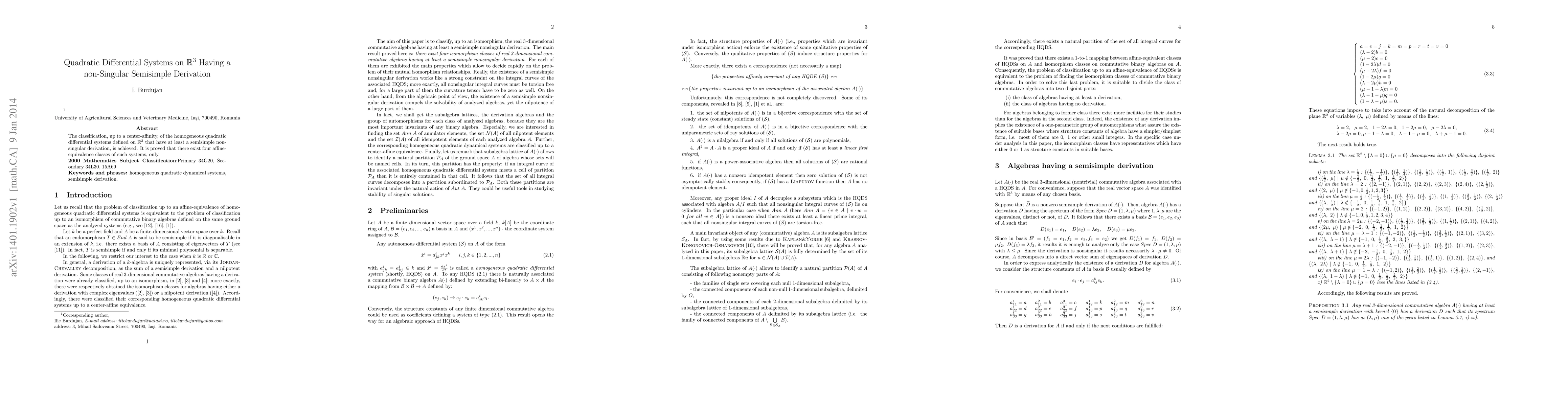 The classification, up to a center-affinity, of the homogeneous quadratic differential systems defined on $\mathbb{R}^{3}$ that have at least a semisimple nonsingular derivation, is achieved. It is proved that there exist four affine-equivalence classes of such systems, only.