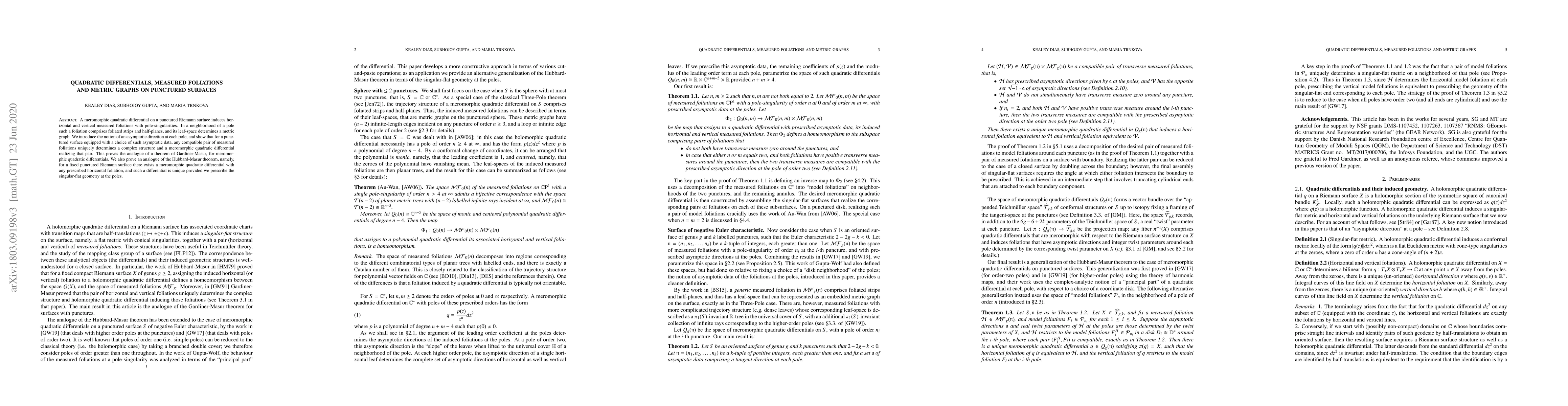 Summary: This paper explores the relationship between meromorphic quadratic differentials on punctured Riemann surfaces and their induced measured foliations, proving that any compatible pair of foliations uniquely determines a complex structure and a corresponding quadratic differential, extending theorems by Gardiner-Masur and Hubbard-Masur.