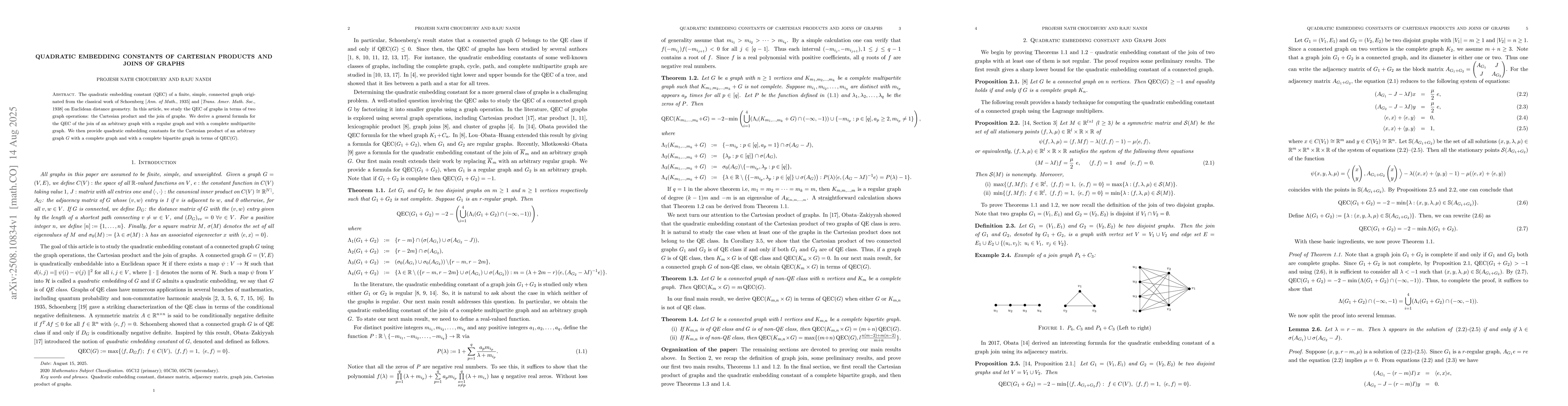 The quadratic embedding constant (QEC) of a finite, simple, connected graph originated from the classical work of Schoenberg [Ann. of Math., 1935] and [Trans. Amer. Math. Soc., 1938] on Euclidean distance geometry. In this article, we study the QEC of graphs in terms of two graph operations: the Cartesian product and the join of graphs. We derive a general formula for the QEC of the join of an arbitrary graph with a regular graph and with a complete multipartite graph. We then provide quadratic embedding constants for the Cartesian product of an arbitrary graph $G$ with a complete graph and with a complete bipartite graph in terms of QEC$(G)$.
