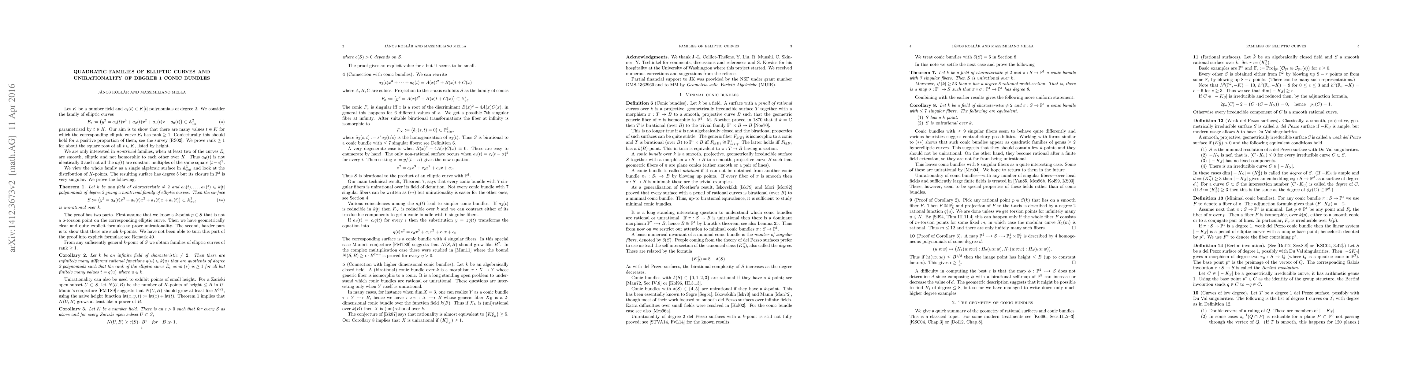 Summary: This paper studies elliptic curves defined by quadratic families and proves that for many values of t, these curves have a rank of at least 1. It shows that these curves form a birational surface modeled by a conic bundle with 7 singular fibers, proving the unirationality of such conic bundles. Additionally, a correction for the main theorem is provided for small finite fields.
