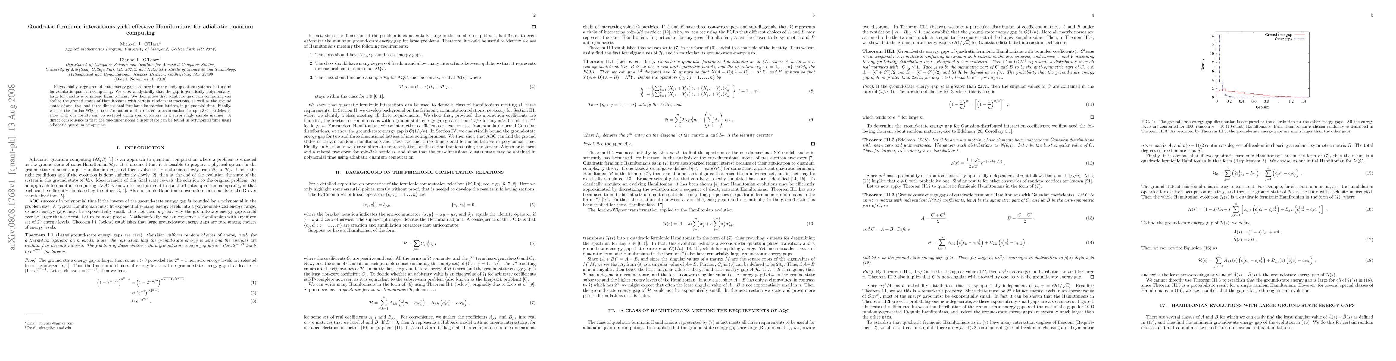 This paper demonstrates that quadratic fermionic Hamiltonians typically have large ground-state energy gaps, which are beneficial for adiabatic quantum computing. It proves that such systems can realize the ground states of various fermionic lattices in polynomial time, and shows that these results can be expressed using spin operators, enabling the one-dimensional cluster state to be found efficiently.
