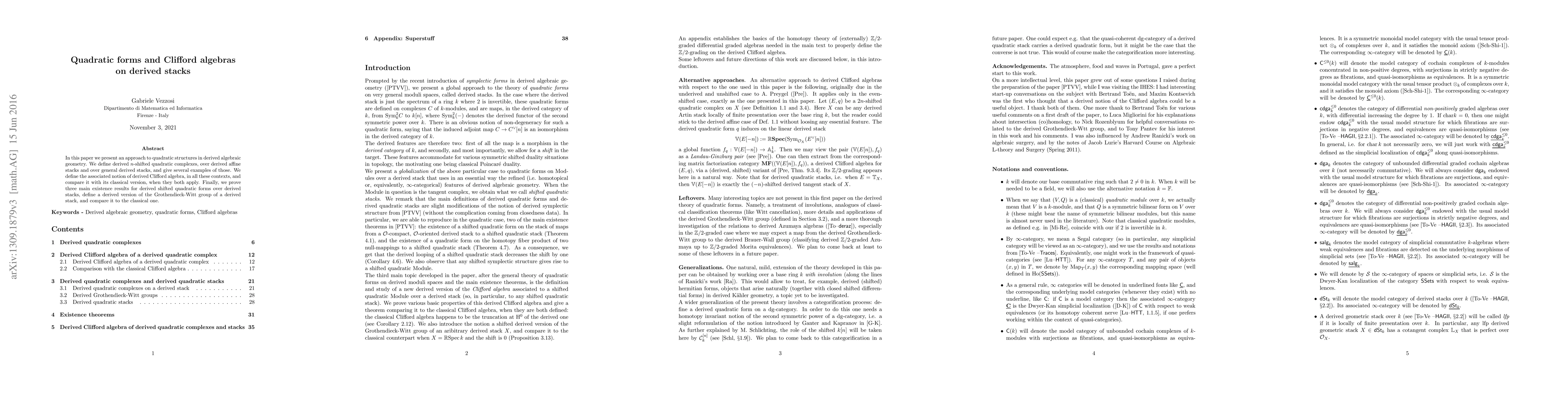 The paper presents an approach to quadratic structures in derived algebraic geometry, defining derived n-shifted quadratic complexes over derived affine stacks and general derived stacks, along with their associated derived Clifford algebras. It proves existence results for derived shifted quadratic forms over derived stacks and constructs a derived version of the Grothendieck-Witt group of a derived stack, comparing it to the classical one.