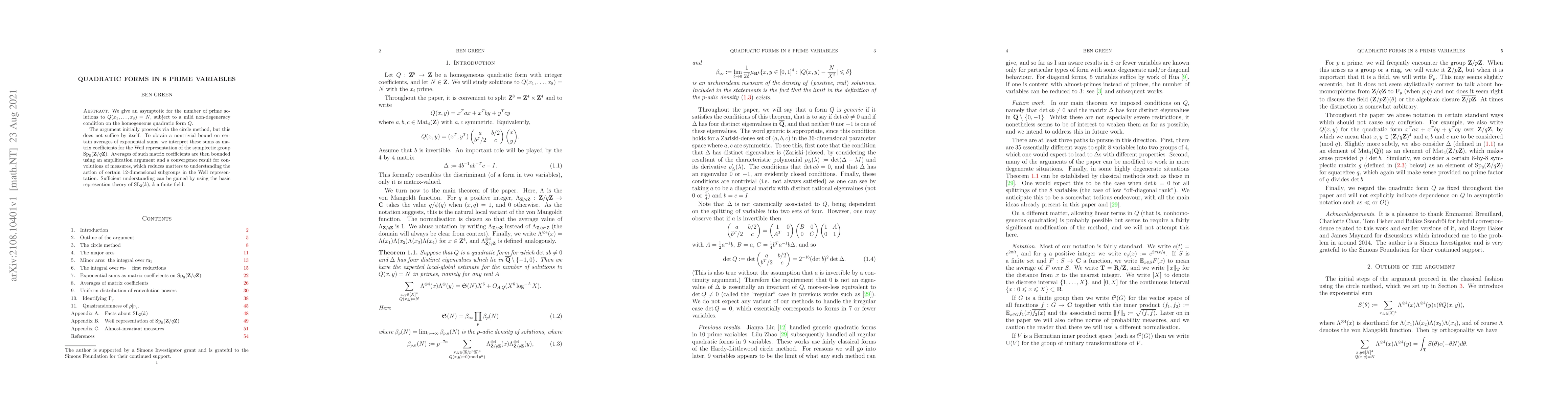 This paper provides an asymptotic estimate for the number of prime solutions to a homogeneous quadratic form in eight variables, employing the circle method and interpreting exponential sums as matrix coefficients for the Weil representation of the symplectic group. The analysis leverages representation theory of finite fields to understand the action of relevant subgroups.