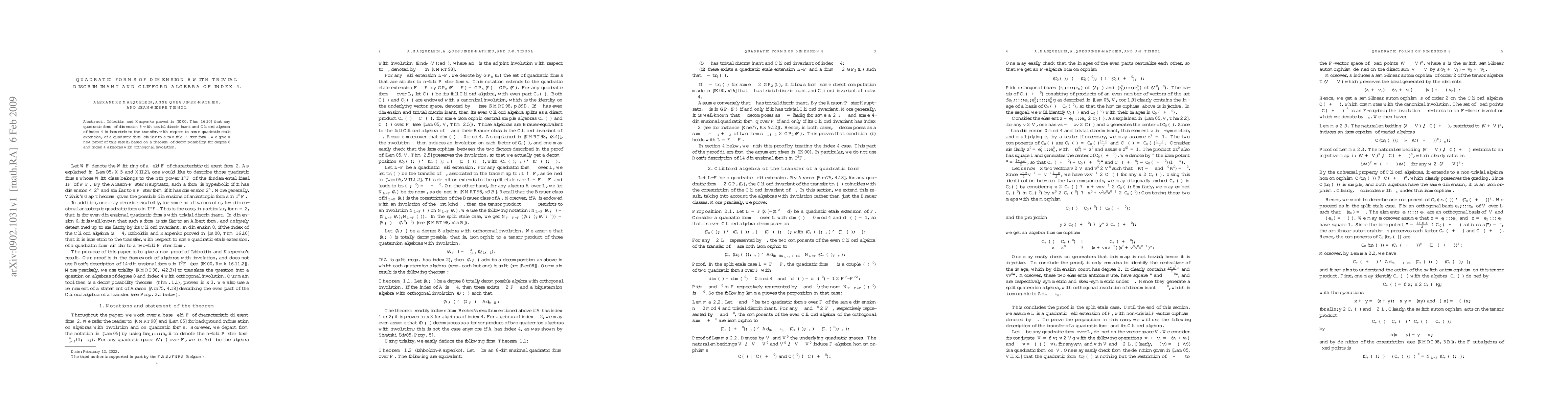 Summary: This paper provides a new proof for the theorem by Izhboldin and Karpenko that any quadratic form of dimension 8 with trivial discriminant and Clifford algebra of index 4 is isometric to a transfer of a quadratic form similar to a 2-fold Pfister form, using a theorem on the decomposability of degree 8 and index 4 algebras with orthogonal involution.