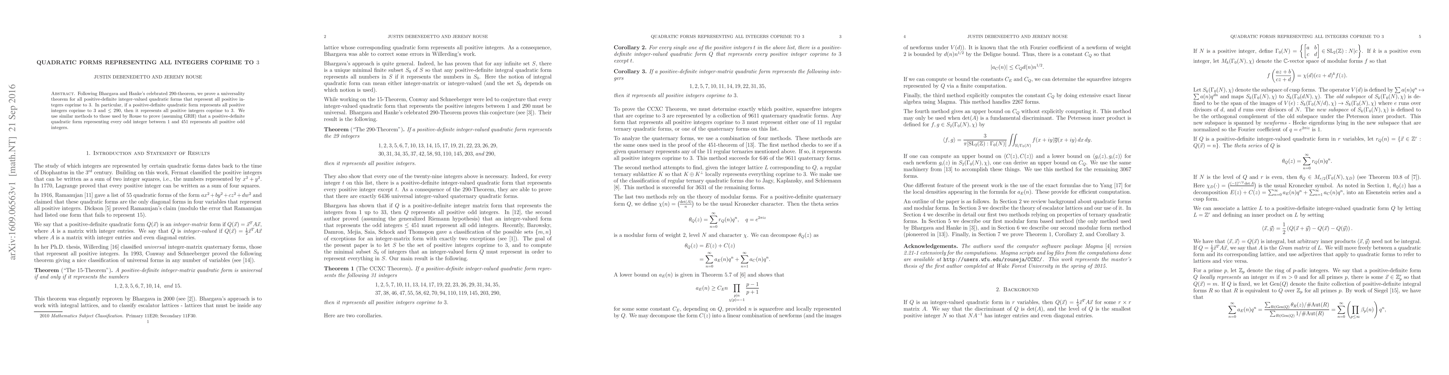 This paper proves a universality theorem for positive-definite integer-valued quadratic forms that represent all integers coprime to 3, extending Bhargava and Hanke's 290-theorem. It shows that any such form representing integers coprime to 3 up to 290 must represent all such integers.