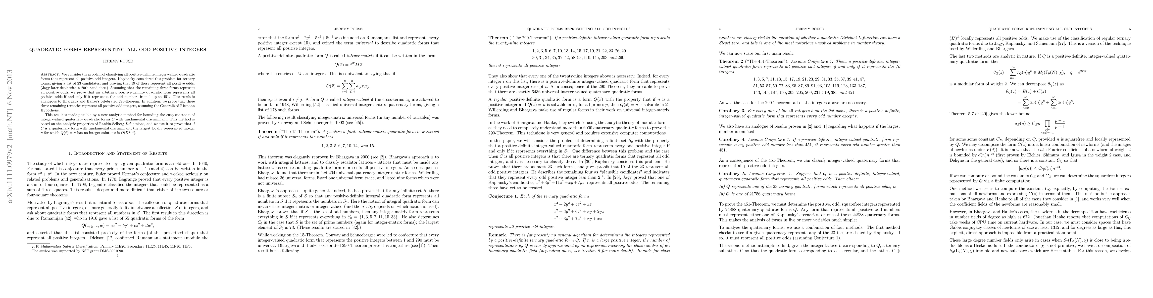 We consider the problem of classifying all positive-definite integer-valued quadratic forms that represent all positive odd integers. Kaplansky considered this problem for ternary forms, giving a list of 23 candidates, and proving that 19 of those represent all positive odds. (Jagy later dealt with a 20th candidate.) Assuming that the remaining three forms represent all positive odds, we prove that an arbitrary, positive-definite quadratic form represents all positive odds if and only if it represents the odd numbers from 1 up to 451. This result is analogous to Bhargava and Hanke's celebrated 290-theorem. In addition, we prove that these three remaining ternaries represent all positive odd integers, assuming the generalized Riemann hypothesis. This result is made possible by a new analytic method for bounding the cusp constants of integer-valued quaternary quadratic forms $Q$ with fundamental discriminant. This method is based on the analytic properties of Rankin-Selberg $L$-functions, and we use it to prove that if $Q$ is a quaternary form with fundamental discriminant, the largest locally represented integer $n$ for which $Q(\vec{x}) = n$ has no integer solutions is $O(D^{2 + \epsilon})$.