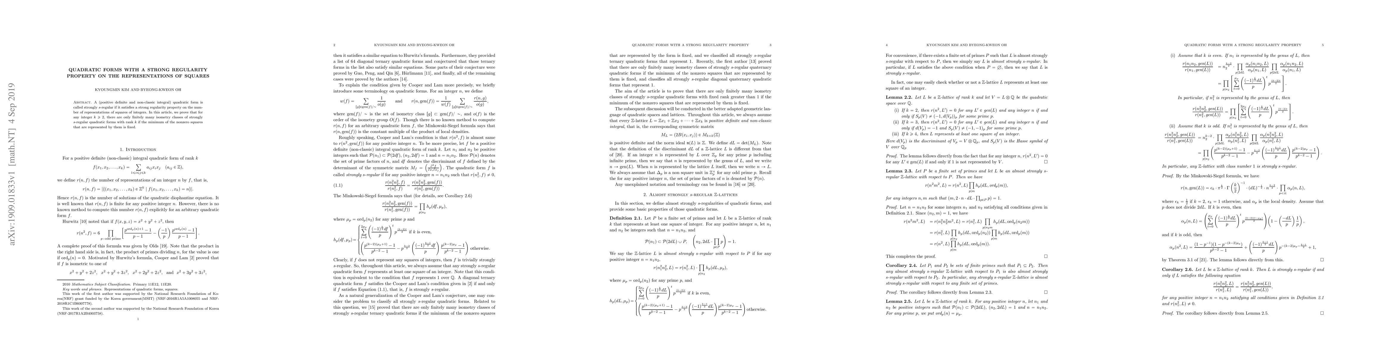 A (positive definite and non-classic integral) quadratic form is called strongly $s$-regular if it satisfies a strong regularity property on the number of representations of squares of integers. In this article, we prove that for any integer $k \ge 2$, there are only finitely many isometry classes of strongly $s$-regular quadratic forms with rank $k$ if the minimum of the nonzero squares that are represented by them is fixed.