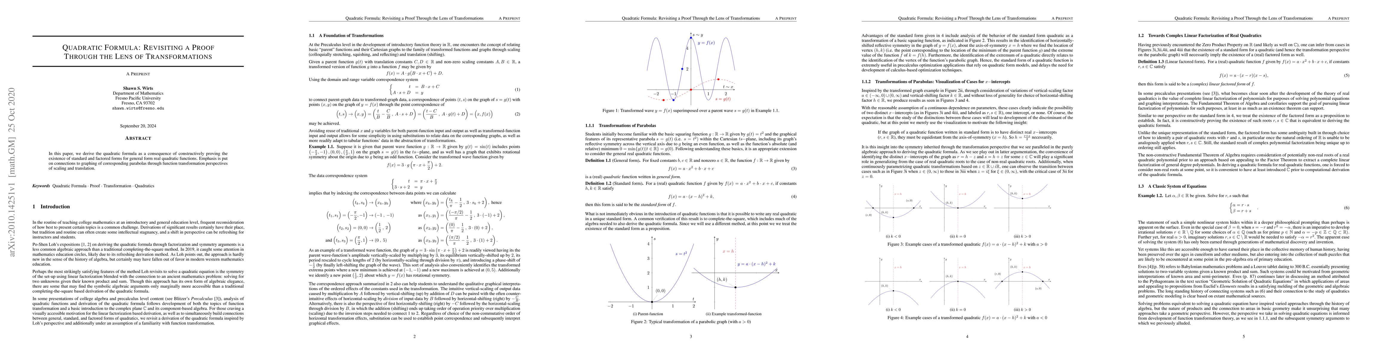 In this paper, we derive the quadratic formula as a consequence of constructively proving the existence of standard and factored forms for general form real quadratic functions. Emphasis is put on connections to graphing of corresponding parabolas through function transformation perspectives of scaling and translation.