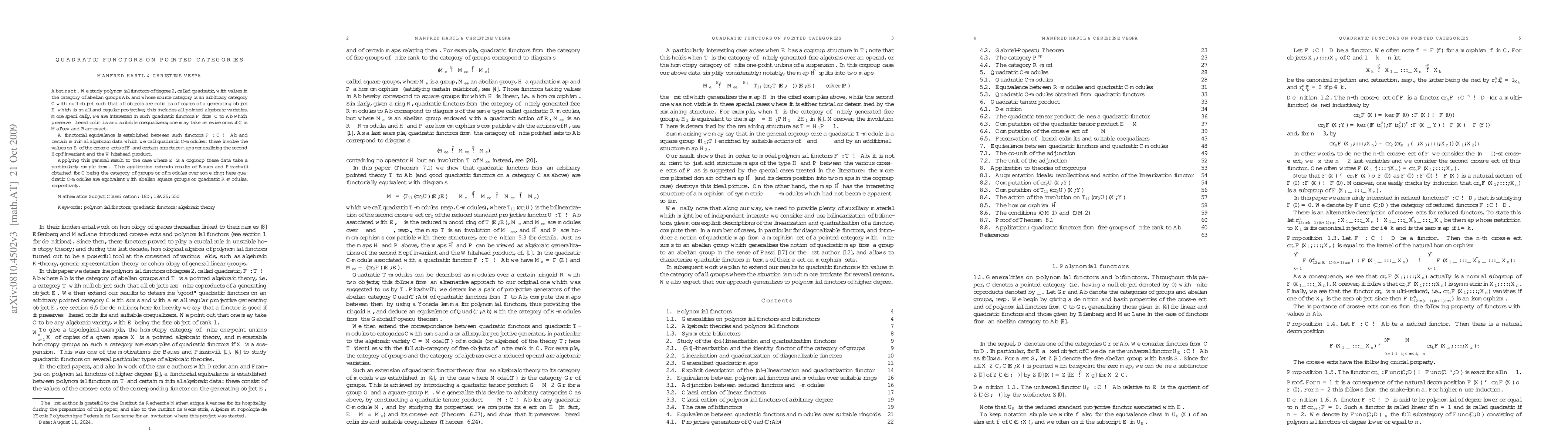 We study polynomial functors of degree 2, called quadratic, with values in the category of abelian groups $Ab$, and whose source category is an arbitrary category $\C$ with null object such that all objects are colimits of copies of a generating object $E$ which is small and regular projective; this includes all pointed algebraic varieties. More specifically, we are interested in such quadratic functors $F$ from $\C$ to $Ab$ which preserve filtered colimits and suitable coequalizers; one may take reflexive ones if $\C$ is Mal'cev and Barr exact. A functorial equivalence is established between such functors $F:\C\to Ab$ and certain minimal algebraic data which we call quadratic $\C$-modules: these involve the values on $E$ of the cross-effects of $F$ and certain structure maps generalizing the second Hopf invariant and the Whitehead product. Applying this general result to the case where $E$ is a cogroup these data take a particularly simple form. This application extends results of Baues and Pirashvili obtained for $\C$ being the category of groups or of modules over some ring; here quadratic $\C$-modules are equivalent with abelian square groups or quadratic $R$-modules, respectively.