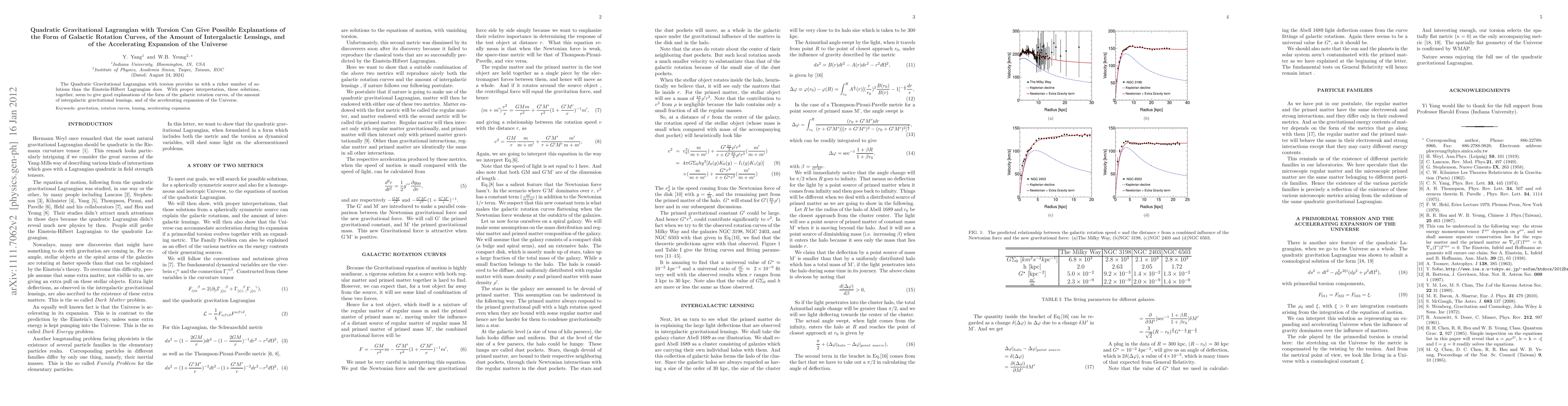 The Quadratic Gravitational Lagrangian with torsion provides us with a richer number of solutions than the Einstein-Hilbert Lagrangian does. With proper interpretation, these solutions, together, seem to give good explanations of the form of the galactic rotation curves, of the amount of intergalactic gravitational lensings, and of the accelerating expansion of the Universe. The existence of Particle Families can also arise from the existence of these various microscopic metrics endowed to the respective particles