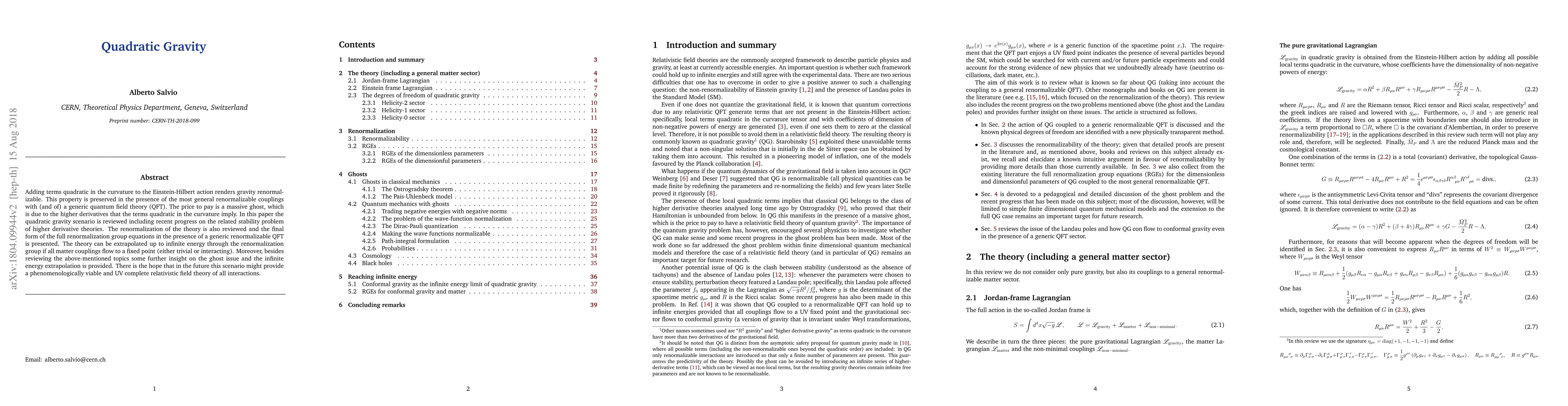 Adding terms quadratic in the curvature to the Einstein-Hilbert action renders gravity renormalizable. This property is preserved in the presence of the most general renormalizable couplings with (and of) a generic quantum field theory (QFT). The price to pay is a massive ghost, which is due to the higher derivatives that the terms quadratic in the curvature imply. In this paper the quadratic gravity scenario is reviewed including recent progress on the related stability problem of higher derivative theories. The renormalization of the theory is also reviewed and the final form of the full renormalization group equations in the presence of a generic renormalizable QFT is presented. The theory can be extrapolated up to infinite energy through the renormalization group if all matter couplings flow to a fixed point (either trivial or interacting). Moreover, besides reviewing the above-mentioned topics some further insight on the ghost issue and the infinite energy extrapolation is provided. There is the hope that in the future this scenario might provide a phenomenologically viable and UV complete relativistic field theory of all interactions.