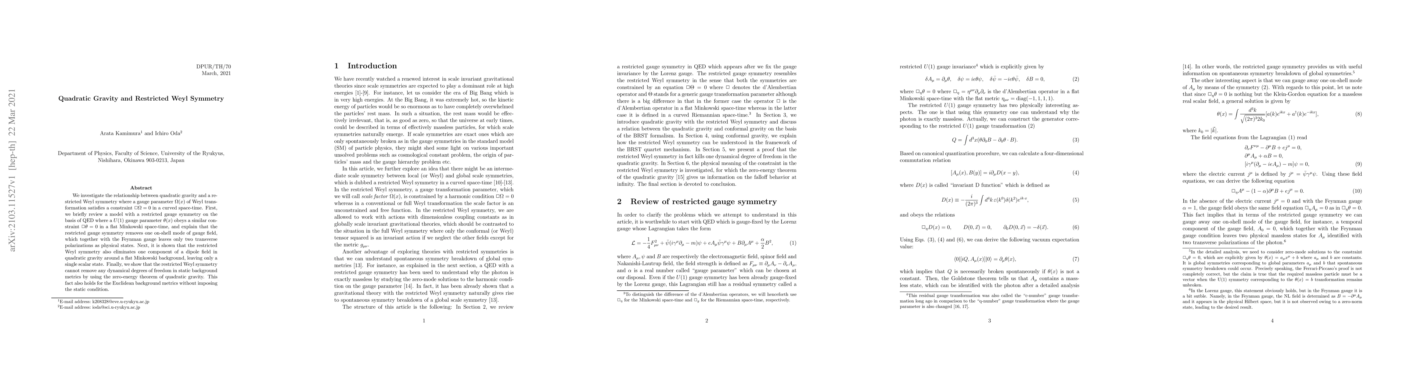 This paper explores the connection between quadratic gravity and restricted Weyl symmetry, demonstrating how a constraint $\Box \Omega = 0$ reduces the dipole field's components to a single scalar state, akin to how restricted gauge symmetry in QED retains only two transverse polarizations. The study concludes that restricted Weyl symmetry cannot eliminate dynamical degrees of freedom in static or Euclidean backgrounds.