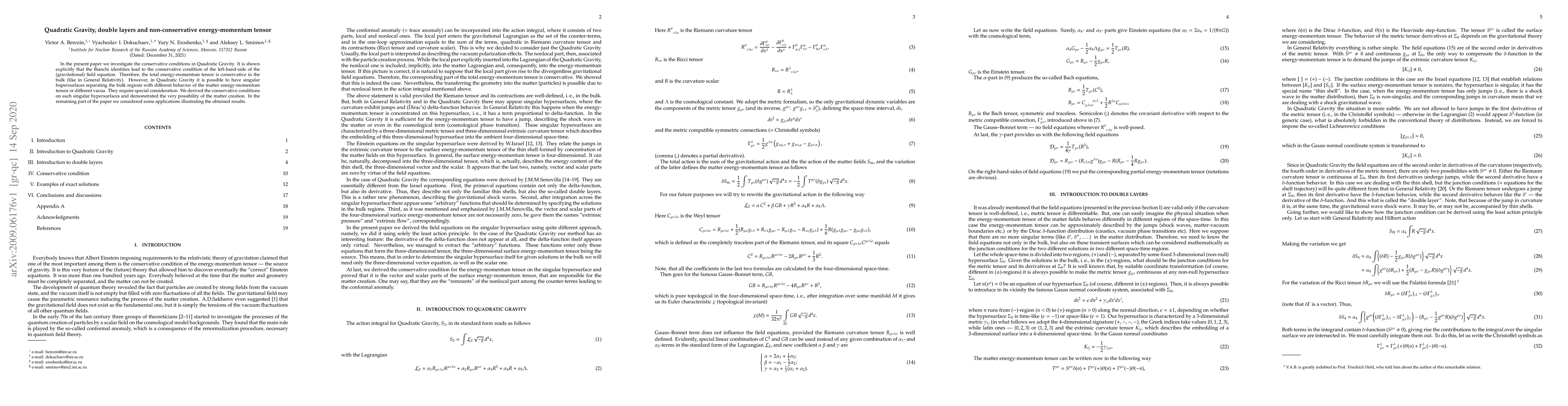 In the present paper we investigate the conservative conditions in Quadratic Gravity. It is shown explicitly that the Bianchi identities lead to the conservative condition of the left-hand-side of the (gravitational) field equation. Therefore, the total energy-momentum tensor is conservative in the bulk (like in General Relativity). However, in Quadratic Gravity it is possible to have singular hupersurfaces separating the bulk regions with different behavior of the matter energy-momentum tensor or different vacua. They require special consideration. We derived the conservative conditions on such singular hypersurfaces and demonstrated the very possibility of the matter creation. In the remaining part of the paper we considered some applications illustrating the obtained results.