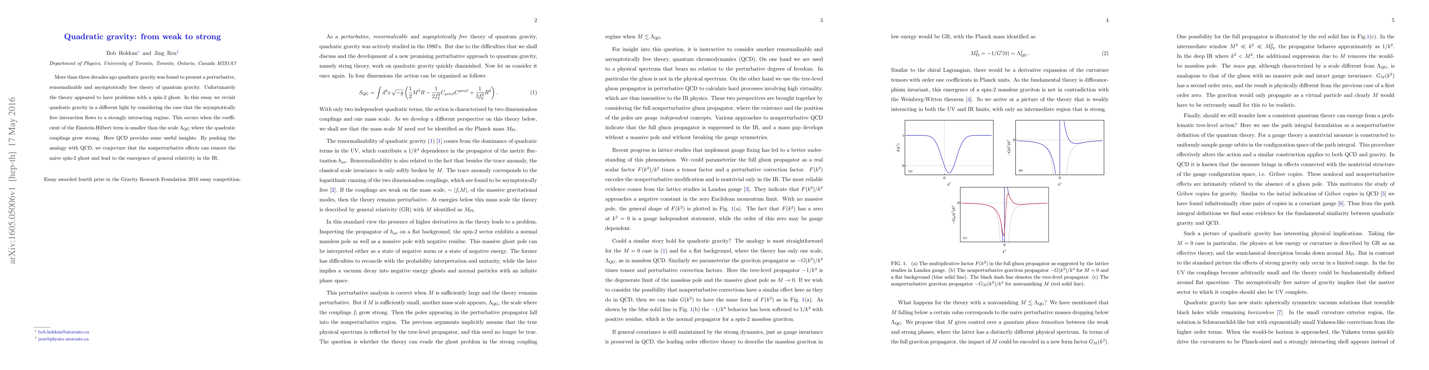 This paper revisits quadratic gravity, suggesting that nonperturbative effects may resolve the spin-2 ghost issue by transitioning to a strongly interacting regime, analogous to QCD, where general relativity emerges in the infrared limit.