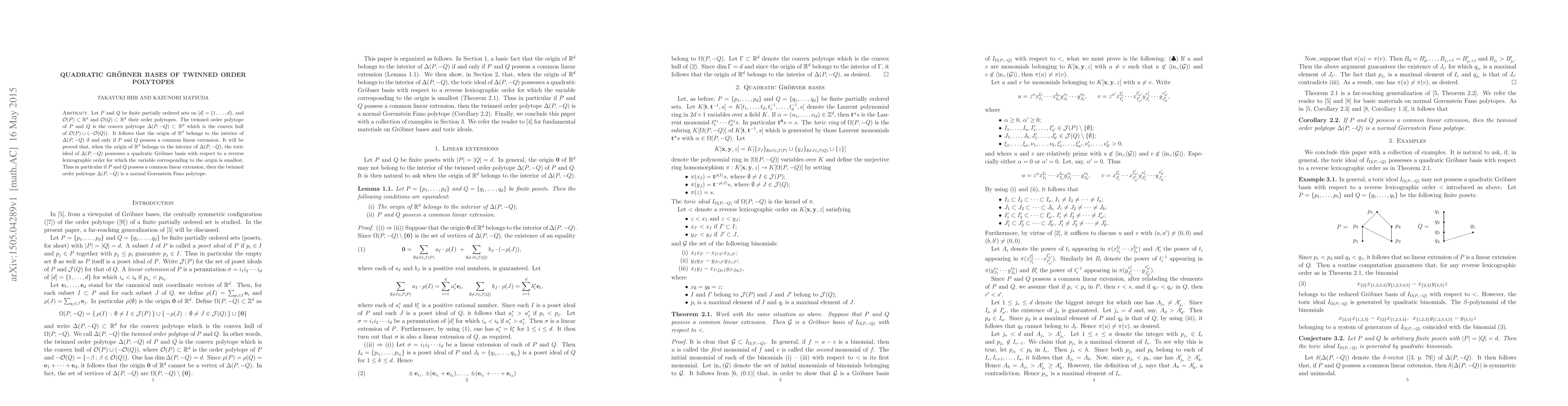 Let $P$ and $Q$ be finite partially ordered sets on $[d] = \{1, \ldots, d\}$, and $\mathcal{O}(P) \subset \mathbb{R}^{d}$ and $\mathcal{O}(Q) \subset \mathbb{R}^{d}$ their order polytopes. The twinned order polytope of $P$ and $Q$ is the convex polytope $\Delta(P,-Q) \subset \mathbb{R}^{d}$ which is the convex hull of $\mathcal{O}(P) \cup (- \mathcal{O}(Q))$. It follows that the origin of $\mathbb{R}^{d}$ belongs to the interior of $\Delta(P,-Q)$ if and only if $P$ and $Q$ possess a common linear extension. It will be proved that, when the origin of $\mathbb{R}^{d}$ belongs to the interior of $\Delta(P,-Q)$, the toric ideal of $\Delta(P,-Q)$ possesses a quadratic Gr\"obner basis with respect to a reverse lexicographic order for which the variable corresponding to the origin is smallest. Thus in particular if $P$ and $Q$ possess a common linear extension, then the twinned order polytope $\Delta(P,-Q)$ is a normal Gorenstein Fano polytope.