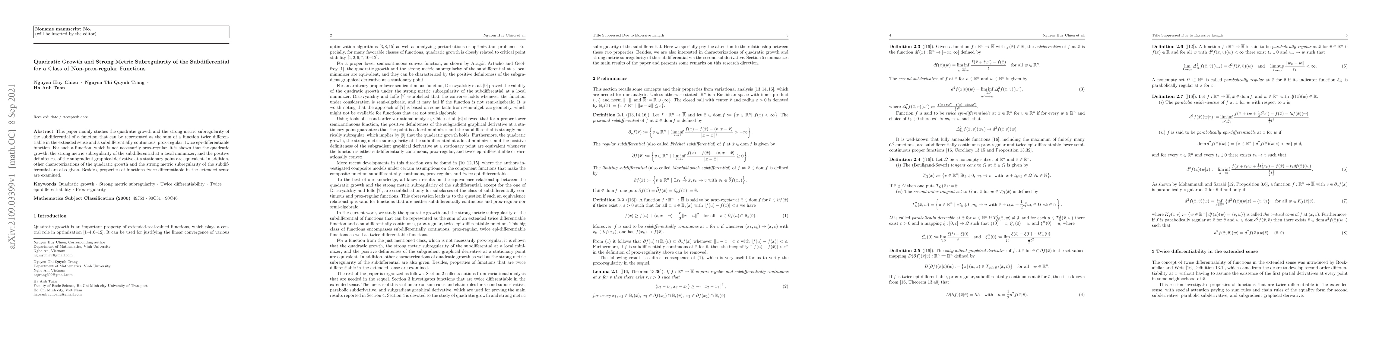 This paper mainly studies the quadratic growth and the strong metric subregularity of the subdifferential of a function that can be represented as the sum of a function twice differentiable in the extended sense and a subdifferentially continuous, prox-regular, twice epi-differentiable function. For such a function, which is not necessarily prox-regular, it is shown that the quadratic growth, the strong metric subregularity of the subdifferential at a local minimizer, and the positive definiteness of the subgradient graphical derivative at a stationary point are equivalent. In addition, other characterizations of the quadratic growth and the strong metric subregularity of the subdifferential are also given. Besides, properties of functions twice differentiable in the extended sense are examined.
