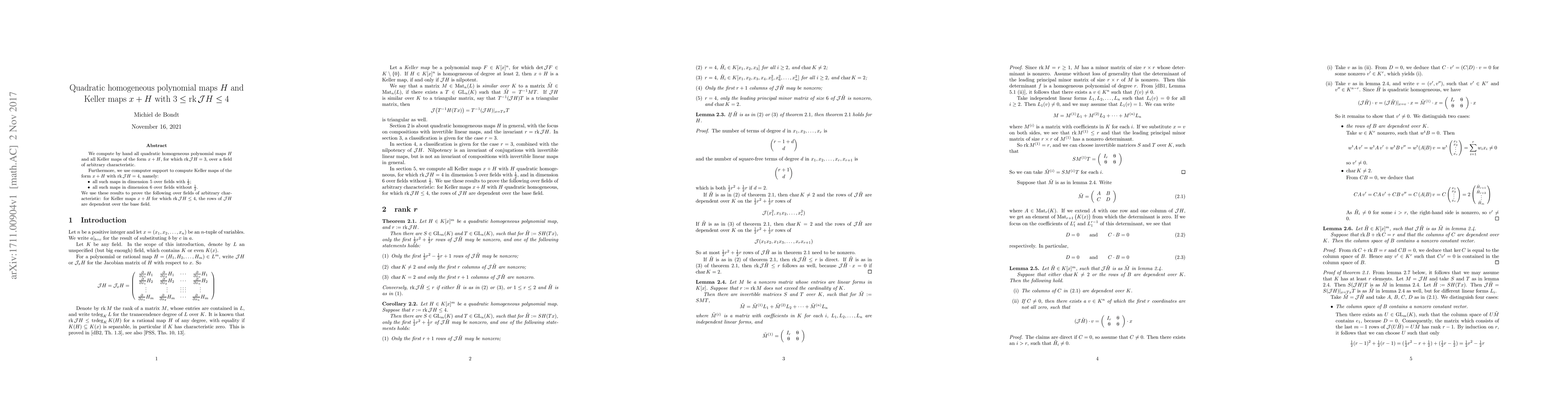 We compute by hand all quadratic homogeneous polynomial maps $H$ and all Keller maps of the form $x + H$, for which ${\rm rk} J H = 3$, over a field of arbitrary characteristic. Furthermore, we use computer support to compute Keller maps of the form $x + H$ with ${\rm rk} J H = 4$, namely: $\bullet$ all such maps in dimension $5$ over fields with $\frac12$; $\bullet$ all such maps in dimension $6$ over fields without $\frac12$. We use these results to prove the following over fields of arbitrary characteristic: for Keller maps $x + H$ for which ${\rm rk} J H \le 4$, the rows of $J H$ are dependent over the base field.