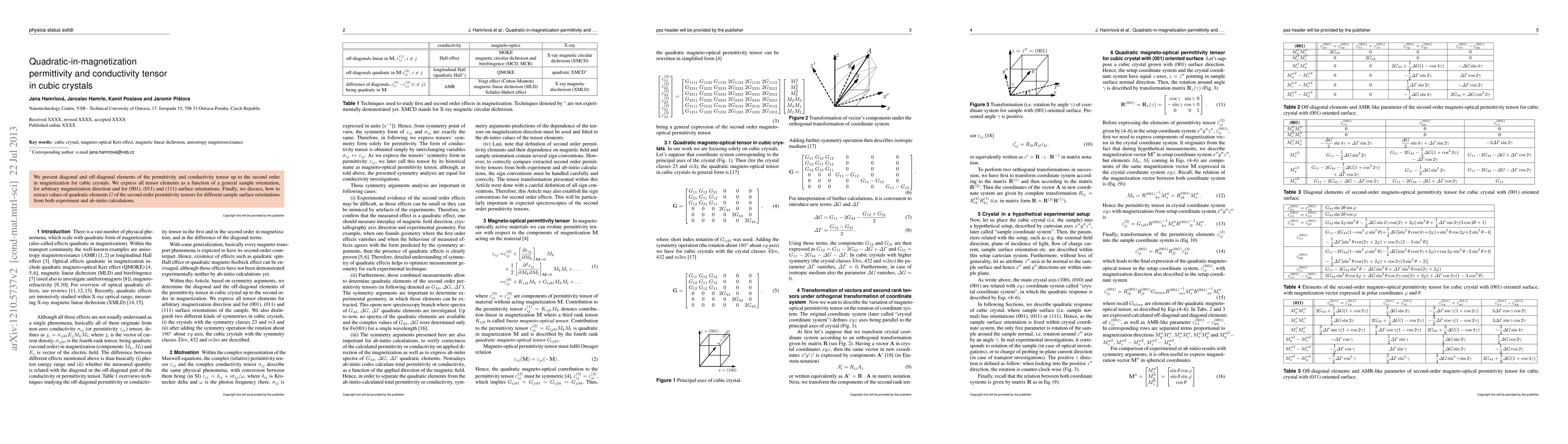 This paper details the quadratic-in-magnetization permittivity and conductivity tensors for cubic crystals, providing expressions for both diagonal and off-diagonal elements as functions of sample orientation and magnetization direction. It also discusses methods for extracting these tensor values from experimental and ab-initio computational data.