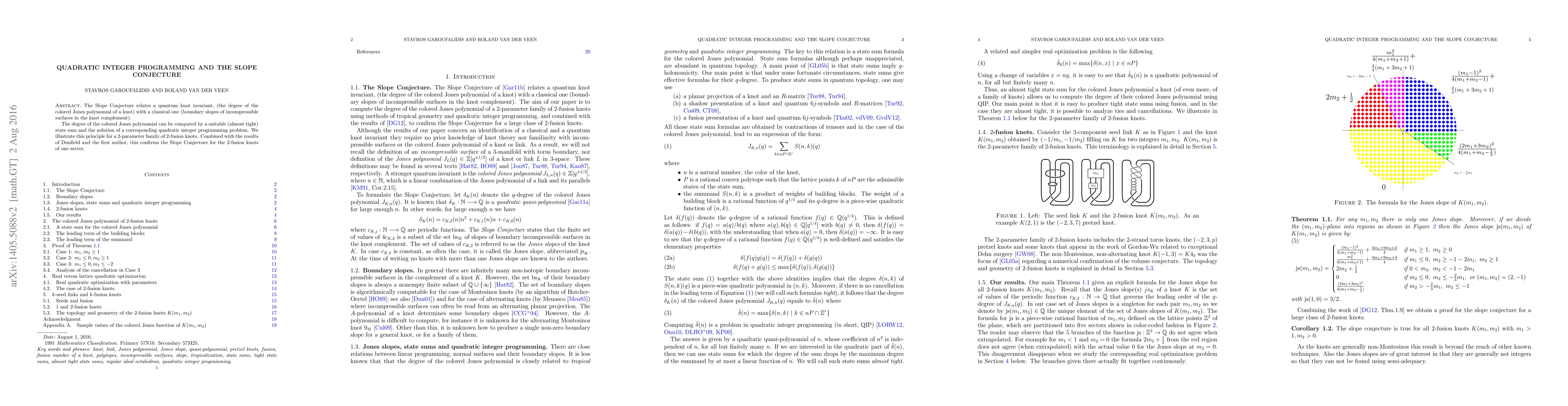 The Slope Conjecture relates a quantum knot invariant, (the degree of the colored Jones polynomial of a knot) with a classical one (boundary slopes of incompressible surfaces in the knot complement). The degree of the colored Jones polynomial can be computed by a suitable (almost tight) state sum and the solution of a corresponding quadratic integer programming problem. We illustrate this principle for a 2-parameter family of 2-fusion knots. Combined with the results of Dunfield and the first author, this confirms the Slope Conjecture for the 2-fusion knots.